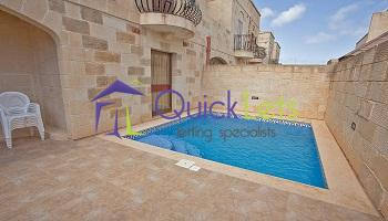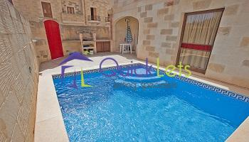Ta’ Gulinu Farmhouse: Located in the Gozitan village of Qala, situated towards the centre of the village and within walking distance of Hondoq Bay. Spread on three floors that forms part of a gated complex, one can find a good sized swimming pool equipped with a deck/BBQ area, kitchen/dining/living, 4 Double Bedrooms, 3 Bathrooms, spare toilet and a terrace overlooking the pool.
