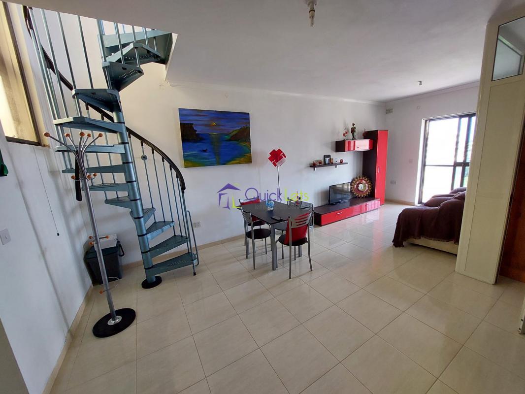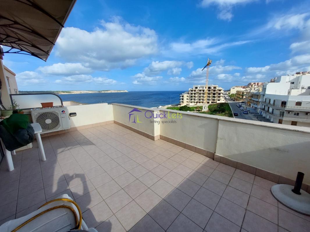 MELLIEHA - (GHADIRA) Duplex Penthouse is located just off the seafront enjoying magnificent country and sea views. The property comprises a living room with a sofa and TV, on the upper floor there is a bright kitchen/ living/ dining area leading to a balcony, main bedroom, main bathroom, storage room, and a large terrace enjoying views, great for entertaining. The property is fully equipped with two air-conditioning units and a washing machine.