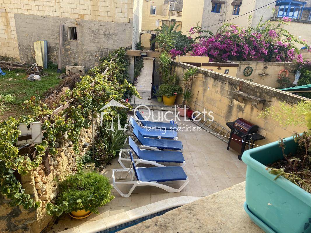 The entrance leads to the courtyard where the pool and BBQ areas are located. At ground floor, a fully equipped kitchen/dining is combined to the sitting/TV area with windows overlooking the pool and a door leading to the washroom and the upper levels. A bedroom equipped with twin beds is also located on this floor.