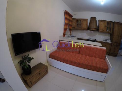 SAN PAWL TAT-TARGA - A semi-detached studio penthouse situated in a quiet area yet close to all amenities. It comprises an open-plan kitchen, living area, and double bed, main bathroom, and front and back terraces with exquisite views. Price includes all services, w&e, cable TV, and internet connection