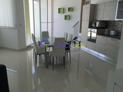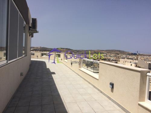 SAN PAWL TAT-TARGA - Here we have a stunning penthouse situated on the fourth floor in a new block in a quiet area of the village close to all amenities. The property comprises three double bedrooms (sleeps 6), two bathrooms, one of which being an en-suite, a large open plan kitchen/living/dining area as well as a washroom. The penthouse also enjoys a large (20sqm) front terrace and a good sized back balcony. This highly finished property comes with a full equipped kitchen, including dishwasher and all new appliances, has air-conditioning throughout and is serviced by a lift which also leads down to an interconnecting two car garage.