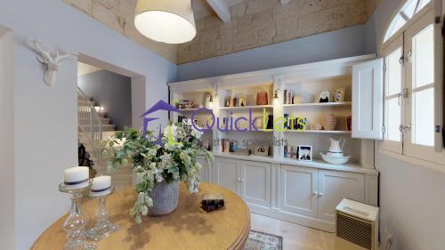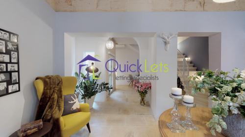 The kitchen opens up to a lovely dining room area with a turfed floor, wood cladding, double volume walls, and feature lighting, however, the best part about this room is the ceiling is remotely retraceable, on a beautiful summer one may dine "al fresco!" one can also find the guest bathroom set on the ground floor level. The Maltese house features many typical architectural characteristics one of which being a well that is still visible through a viewing glass panel.
