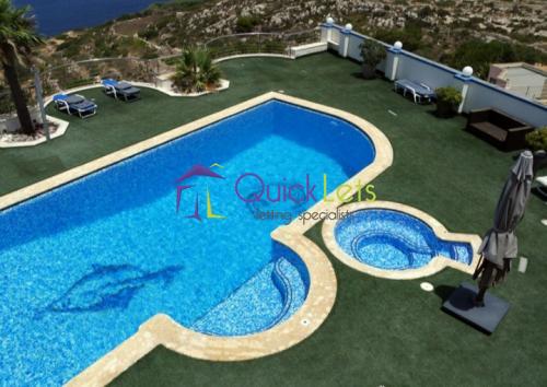 MELLIEHA- Exquisite detached villa in Santa Marija Estates. The property consists of three floors measuring around 2000sqm. Upon entrance one will find a huge open plan with a living area overlooking the pool area. There are three double bedrooms and three bathrooms. On the top level there is another three double bedrooms and the whole roof. There is the use of the elevator which can be used to access the ground floor level. This comprises another large open plan kitchen and living area which leads to the outdoor area. This includes a large pool, BBQ and sunbathing area, an outdoor oven which is all overlooking stunning 360 degrees sea views.