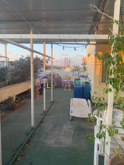 The apartment consists of a fully equipped kitchen, living/dinning room, one double bedroom with some extra space, and one single room upstairs. Air conditioning, washing machine, two bathrooms, part of the roof with a very nice city view.