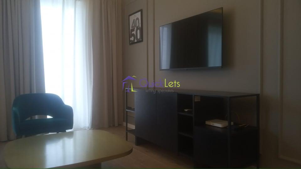 The property itself comprises an open plan living dining layout as well as a 55 Inch LCD TV, large bay windows with access to a large terrace, high-end kitchen appliances including a dishwasher, fridge freezer. The property has AC throughout. The Master bedroom has ample storage as well as an ensuite bathroom. The second bedroom can also be found with a double bed with storage and AC too.