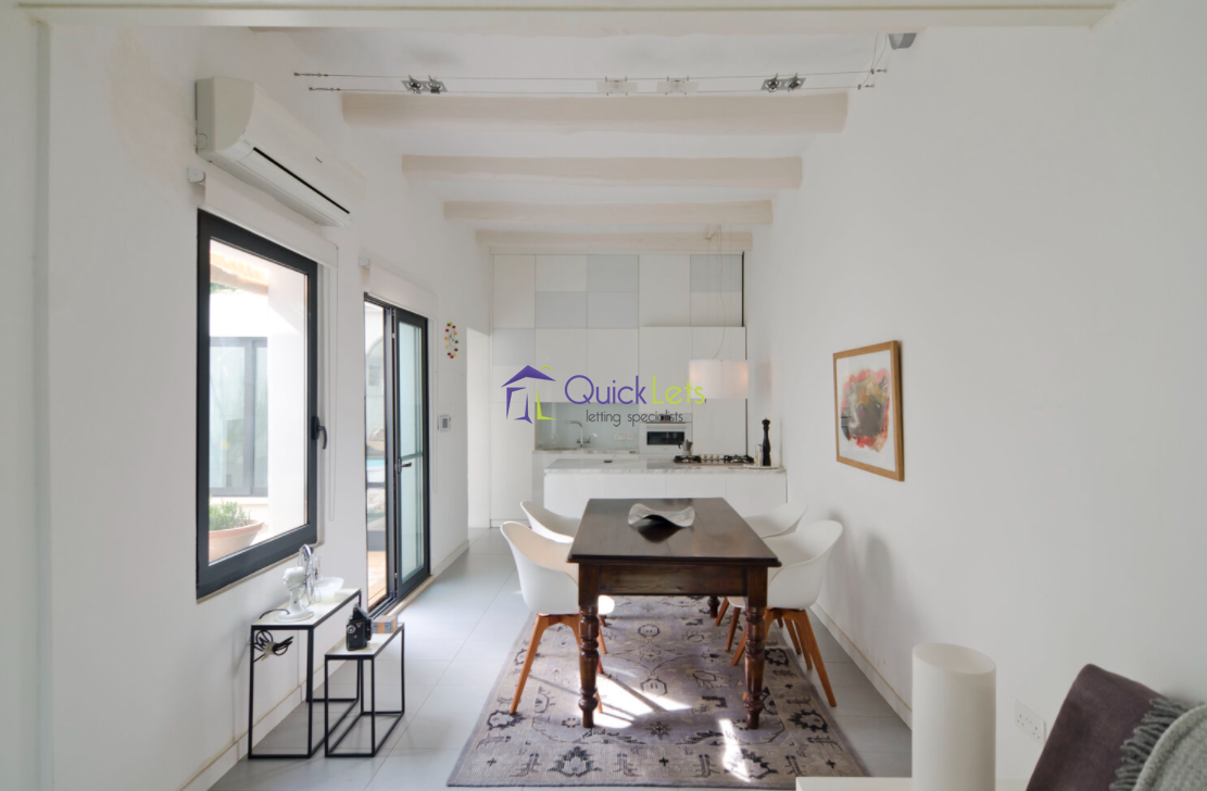A stunning townhouse designed with attention to detail, situated in the town of Birkirkara. The property is in a quiet residential area, considered as the old part of the area, yet close to all amenities such as groceries, bus stops, and so on. The property is made of four floors. Upon entrance, one finds a small hallway that leads to a study, On the first floor there is an open plan with a fully equipped kitchen, living and dining area, a guest bathroom, and a central courtyard approx.. 5m x 4m which can be used for entertaining. On the next level, there is the main bedroom with a double bed, a spare bedroom with a single bed and the main bathroom. Lastly, there is the top floor which comprises a spacious washroom and the roof terrace. The property is fully finished and fully equipped with all appliances including a washing machine, dishwasher, air conditioning for the living and bedroom areas, RO water filter, and a Solar water heater.