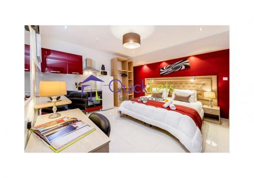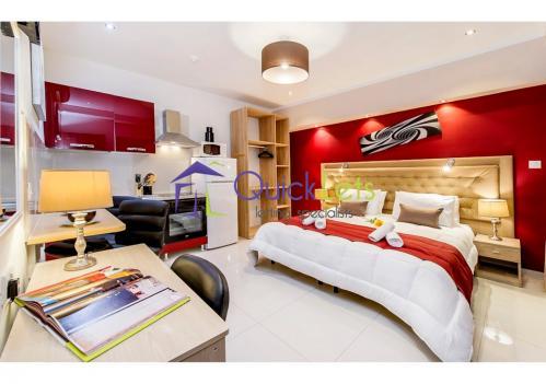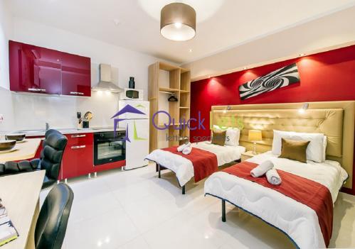 SWIEQI - Lovely studio apartment, walking distance to St Julian. It includes a kitchenette with a seating area, wall-mounted flat-screen TV, and a shower room. The studio also has access to a medium-sized courtyard.