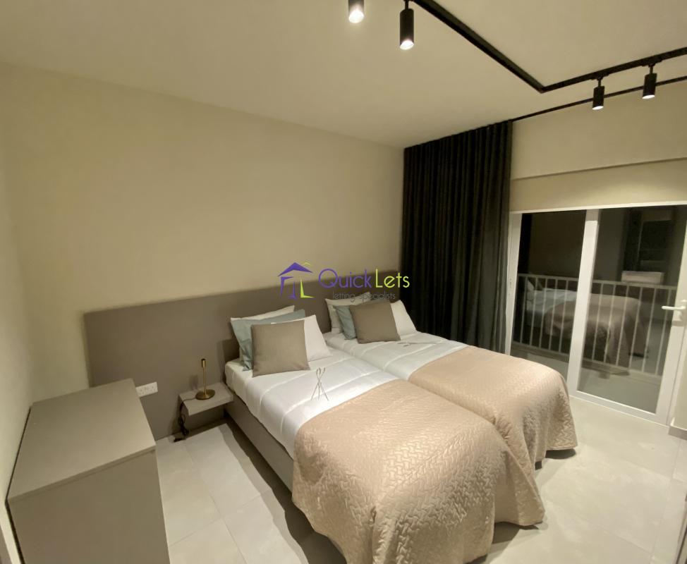 SAN GWANN-Forming part of a residential apartment block, we have an open plan apartment located on the fifth floor. Two bedrooms, two bathrooms, balcony. Finished to a very high standard, including all appliances and air conditioning.