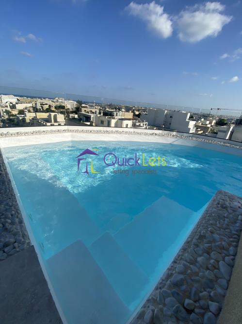 The rooftop has a corner swimming pool with a view, sunbeds, a table and chairs, a toilet, and a shower area.