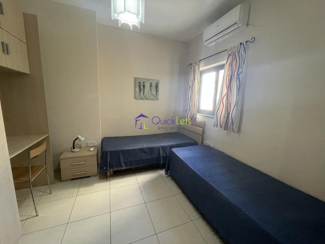GZIRA- Here we have a two-bedroom, one-bathroom apartment situated on the 4th floor. Apartment compromising of an open plan, kitchen-living and dining leading to a front balcony overlooking the street. The main bedroom at the back also has a back balcony letting in a lot of natural light. Second bedroom equipped with twin beds and an office desk. The property comes fully furnished and finished, including Air Condition in every room. Property is ready to move into.
