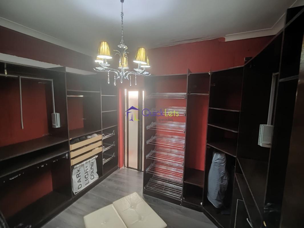 Walk in wardrobe (used to be a 3rd bedroom) with parquet flooring and adjoining bathroom