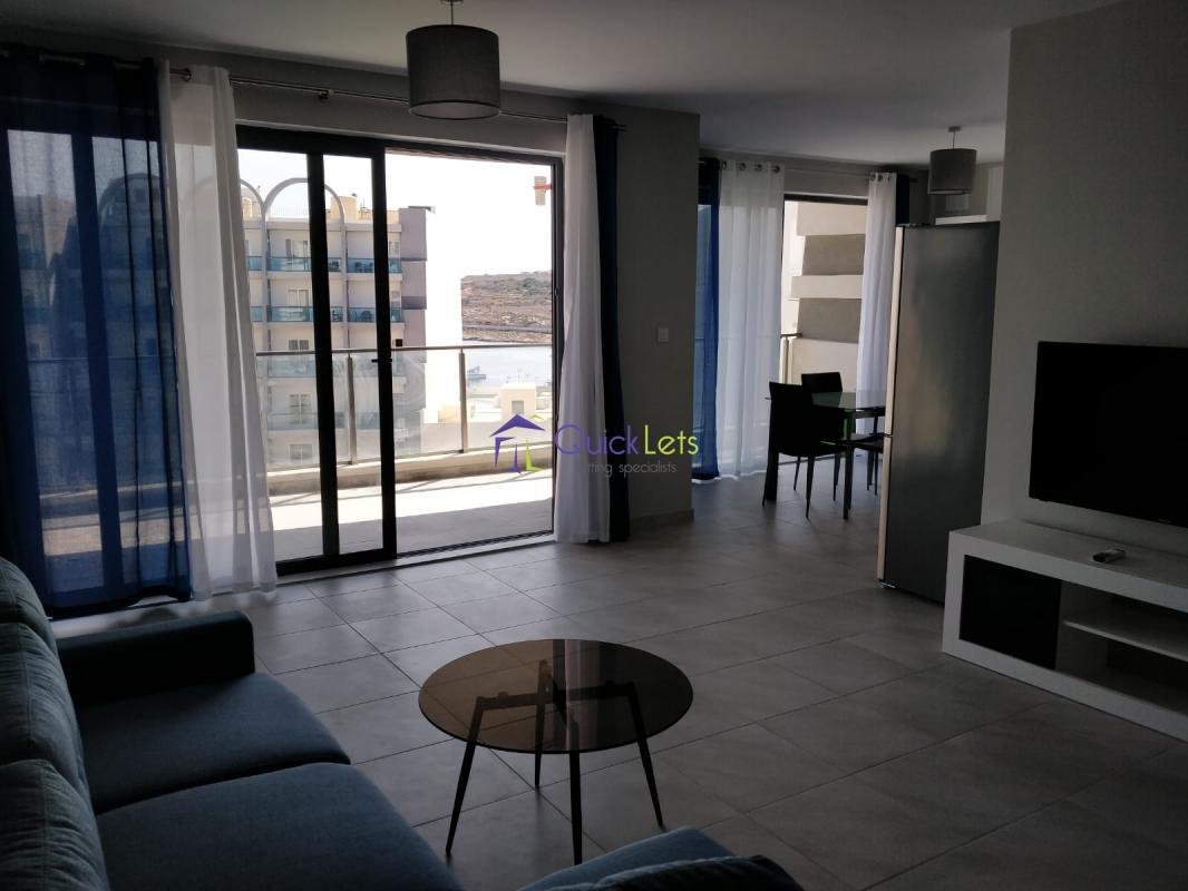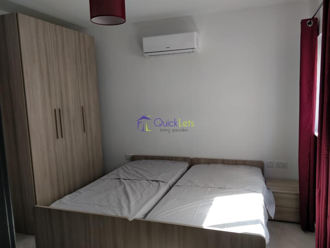 QAWRA - Brand new two bedroom apartment in Qawra. Have an open plan kitchen/living/dining area leading to the front terrace with distance sea view. Main double bedroom with en suit shower and the second bedroom is with two single beds. Full AC, guest bathroom and close to all your daily amenities.