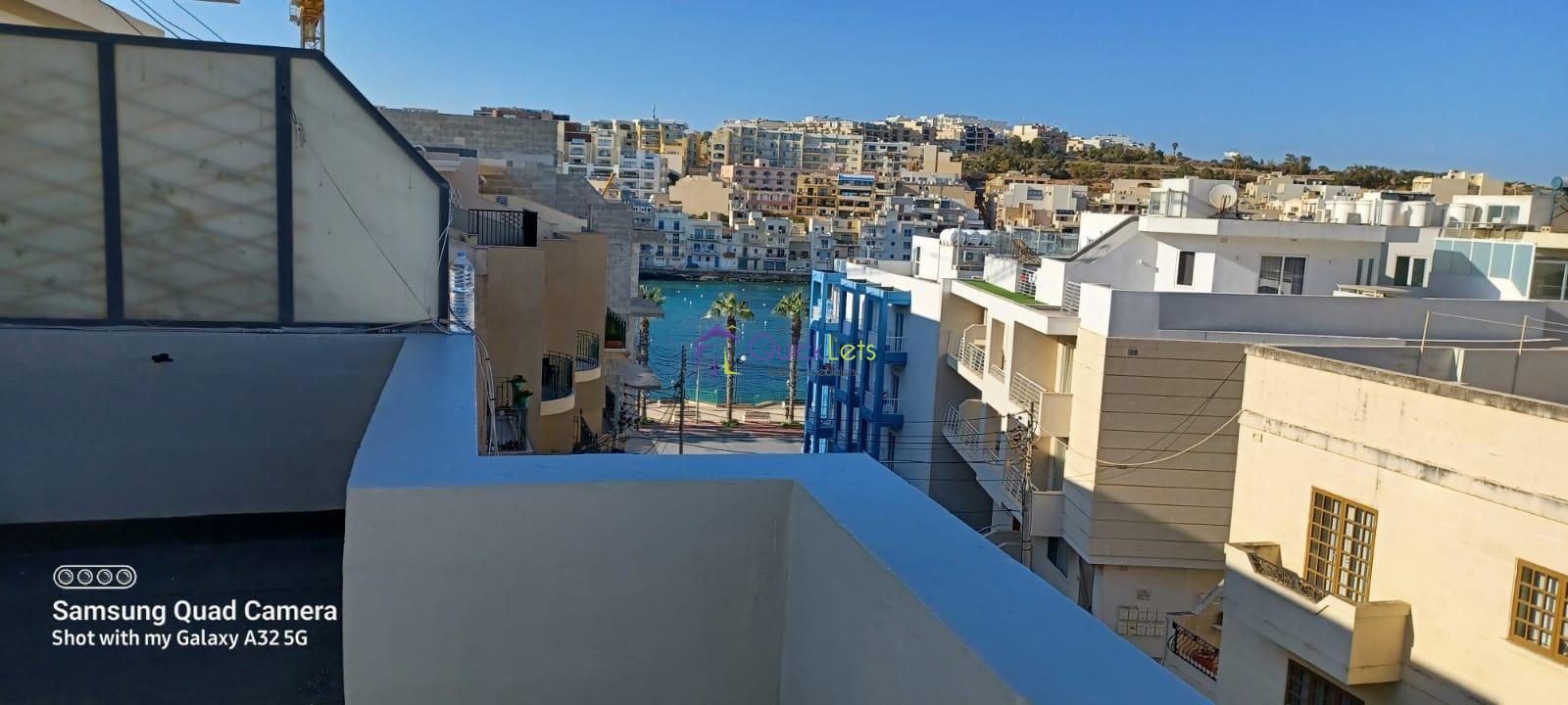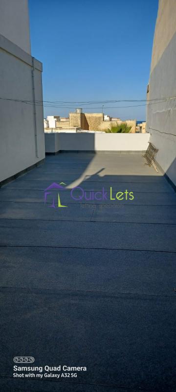 MARSASKALA - A one-bedroom penthouse located on the third floor. There is no lift in the block. The penthouse has an open plan kitchen/dining/sitting area, a bedroom with a double bed, a bathroom with a shower, a large front terrace, and a back balcony. The location is very close to the sea and all daily amenities.