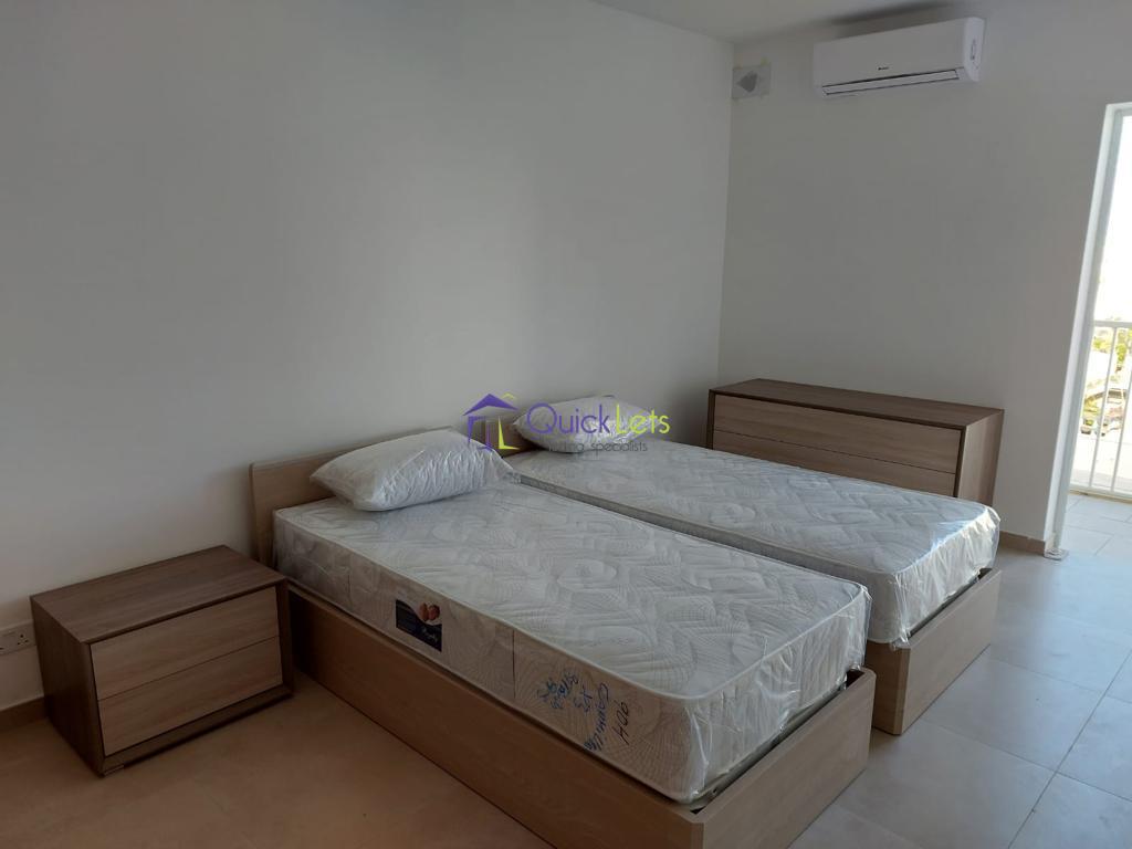 ST. PAUL'S BAY - Three-bedroom apartment brand new (2022) in a quiet area of St. Paul's bay close to all the amenities and a Side Sea view. Which consists of an open plan kitchen/living/dining with a fully equipped, washing machine, LCD tv, ACs, and all the necessities that you need, etc. Three bedrooms, two double and one with two singles, two bathrooms one of them en-suite, one main bathroom, and a nice balcony with a side sea view. One car garage connected in the same block.