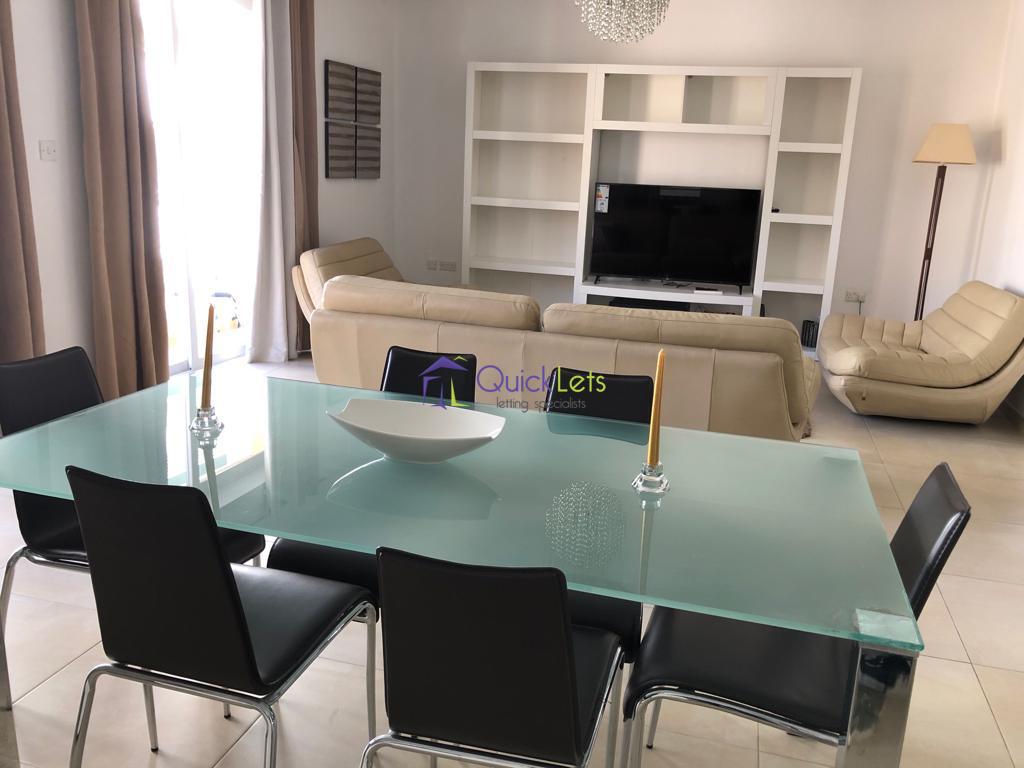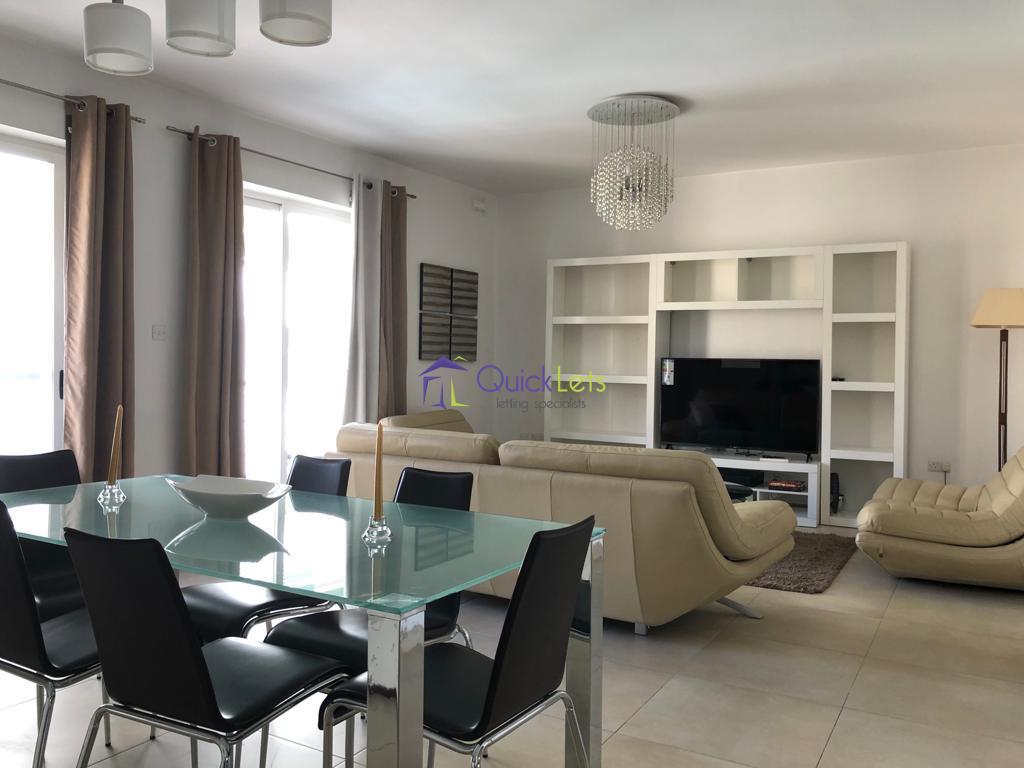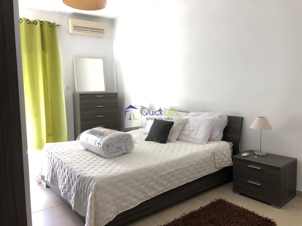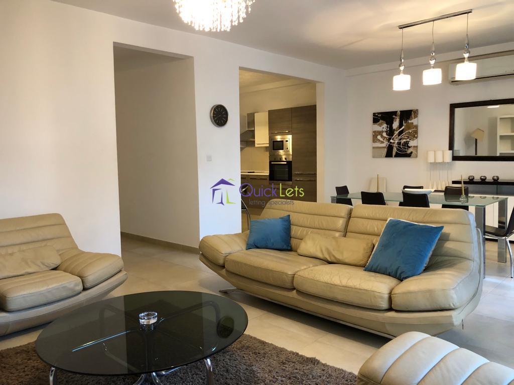 SLIEMA - modern cosy three bedroom apartment, situated in the heart of area close to the sea, kids playground, promenade, large shopping mall and all amenities for your convenience. Very spacious, with open plan kitchen living dining leading to the long front balcony facing the town. Two bedrooms are with double beds. Property complimented with a study room, utility room, back balcony and two bathrooms (one is ensuite). Fully equipped and air-conditioned. Must be seen to be fully appreciated !