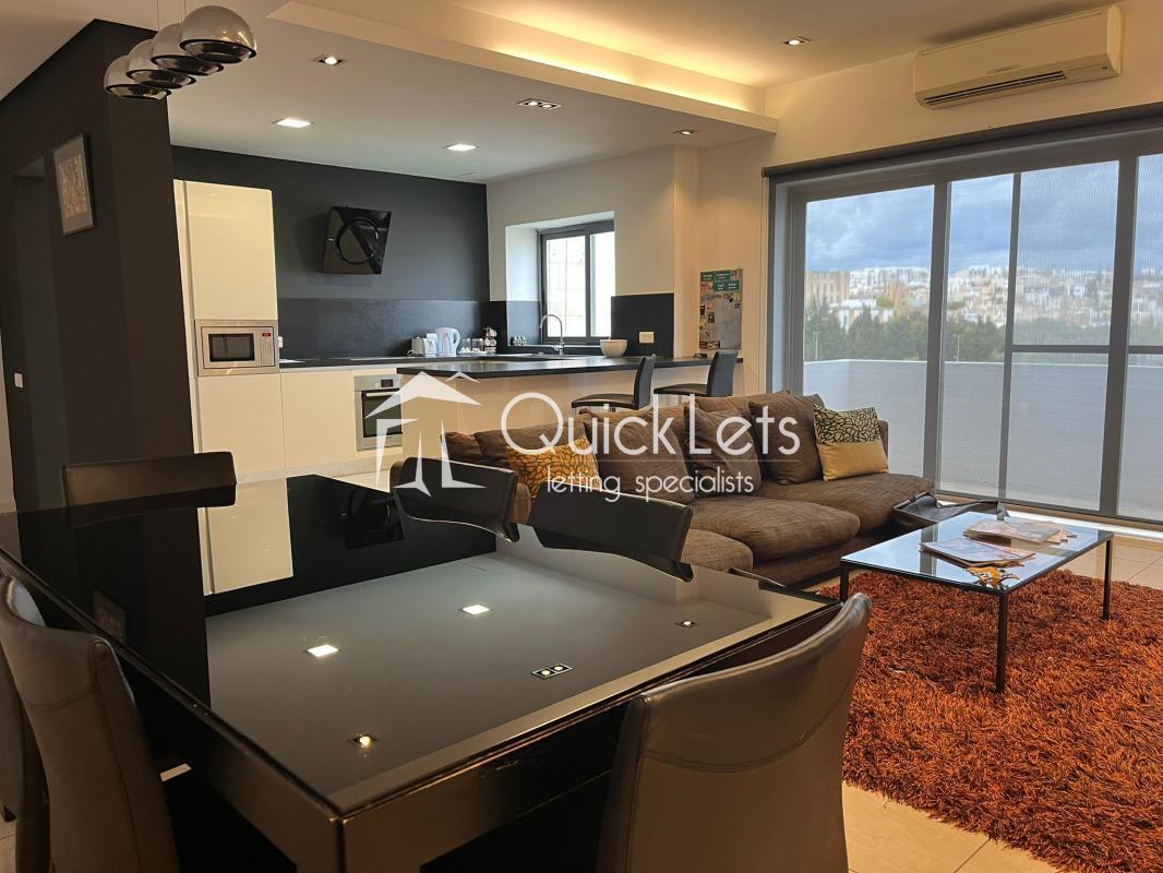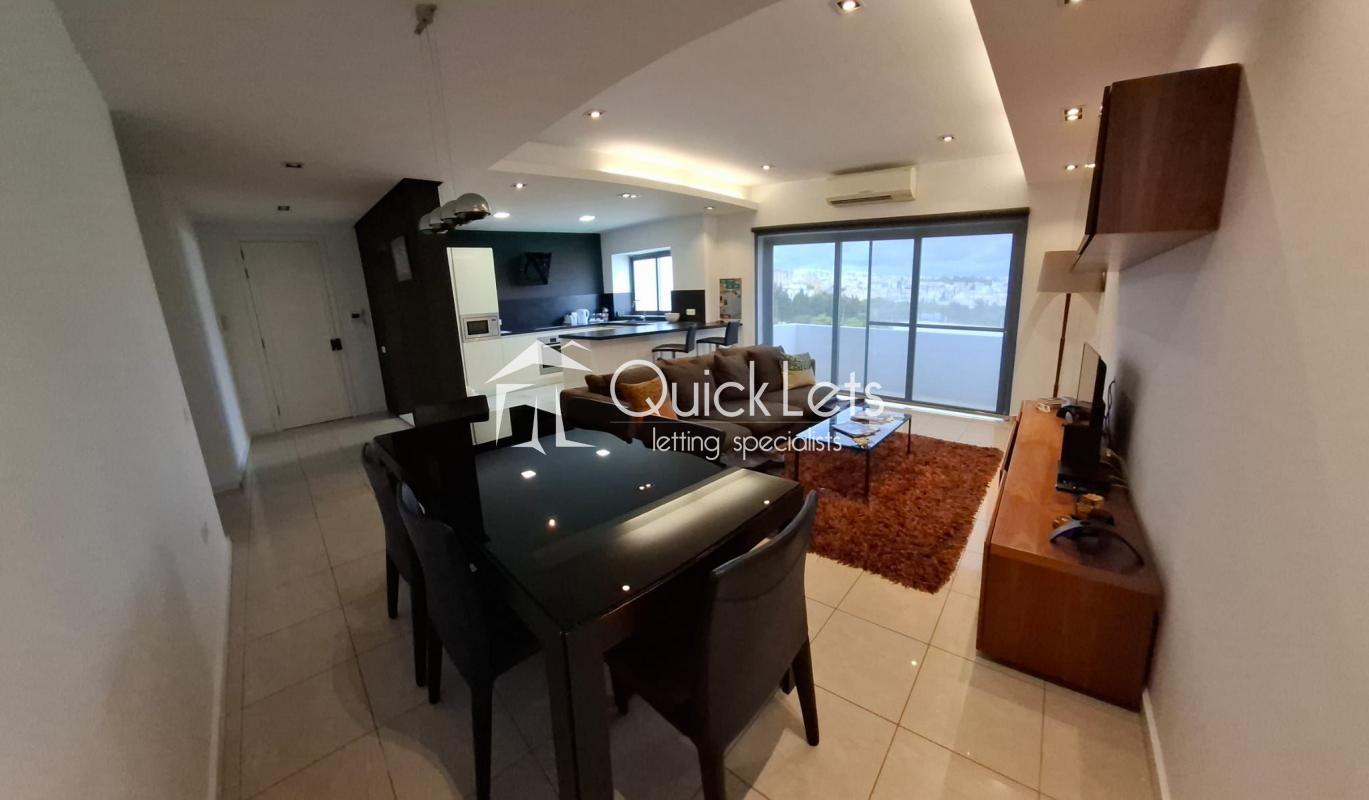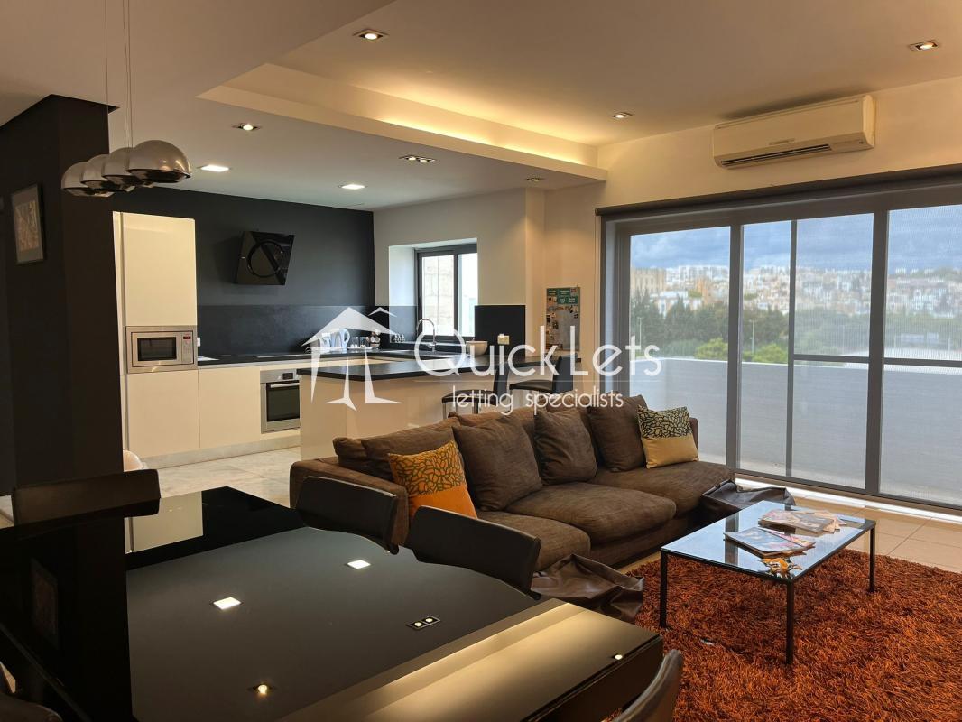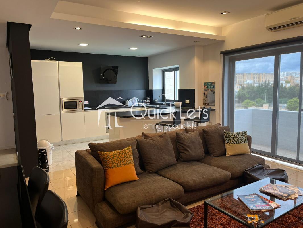 MSIDA - A spacious modern, top-floor two-bedroom apartment with unobstructed town views. Layout comprises an open plan, fully equipped kitchen/living/dining, small balcony, two bedrooms (main with en-suite), and the main bathroom. The property is furnished to high standards, includes part ownership of the roof, and is close to all amenities.