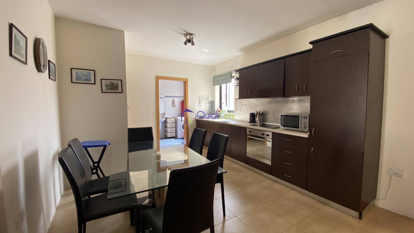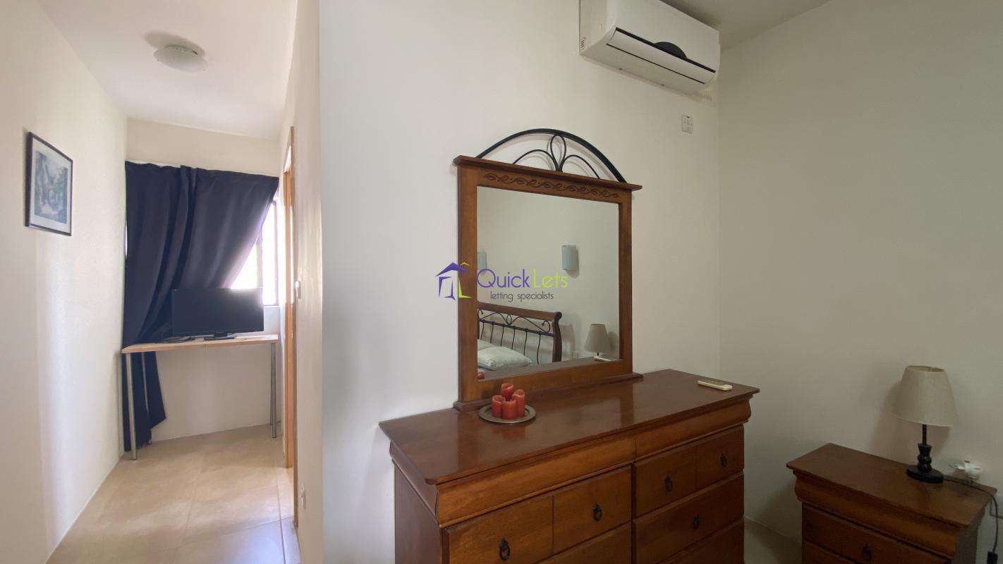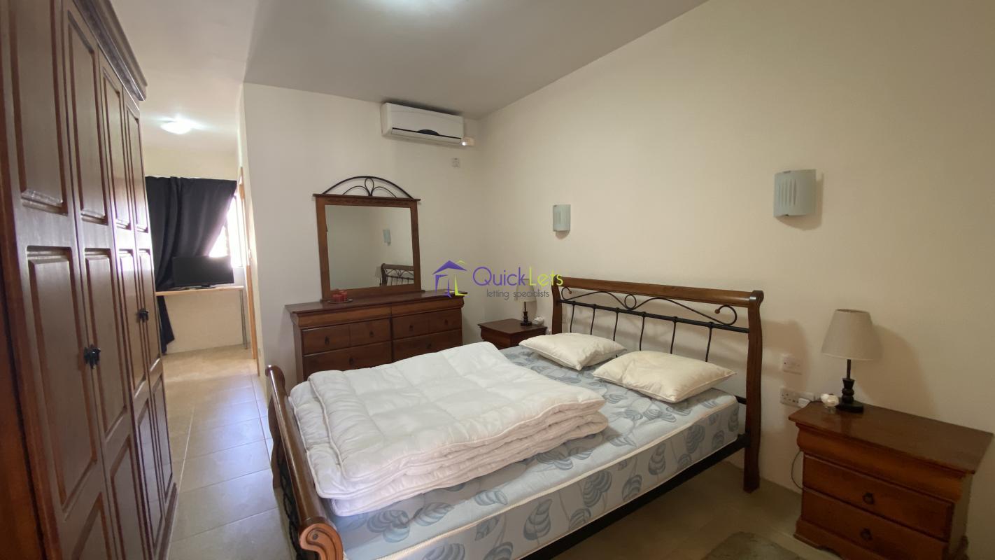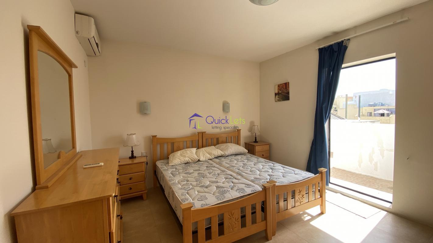 GZIRA - A two-bedroom penthouse located just a few minutes away from the sea. The block is served by the lift. The layout consists of the kitchen/dining/sitting area, a double main bedroom with an en-suite (bathtub), the main bathroom with the bathtub, a spare bedroom with twin beds and access to the back terrace, and a study room with the access to the large front terrace. The penthouse is finished, furnished, and has three A/Cs.