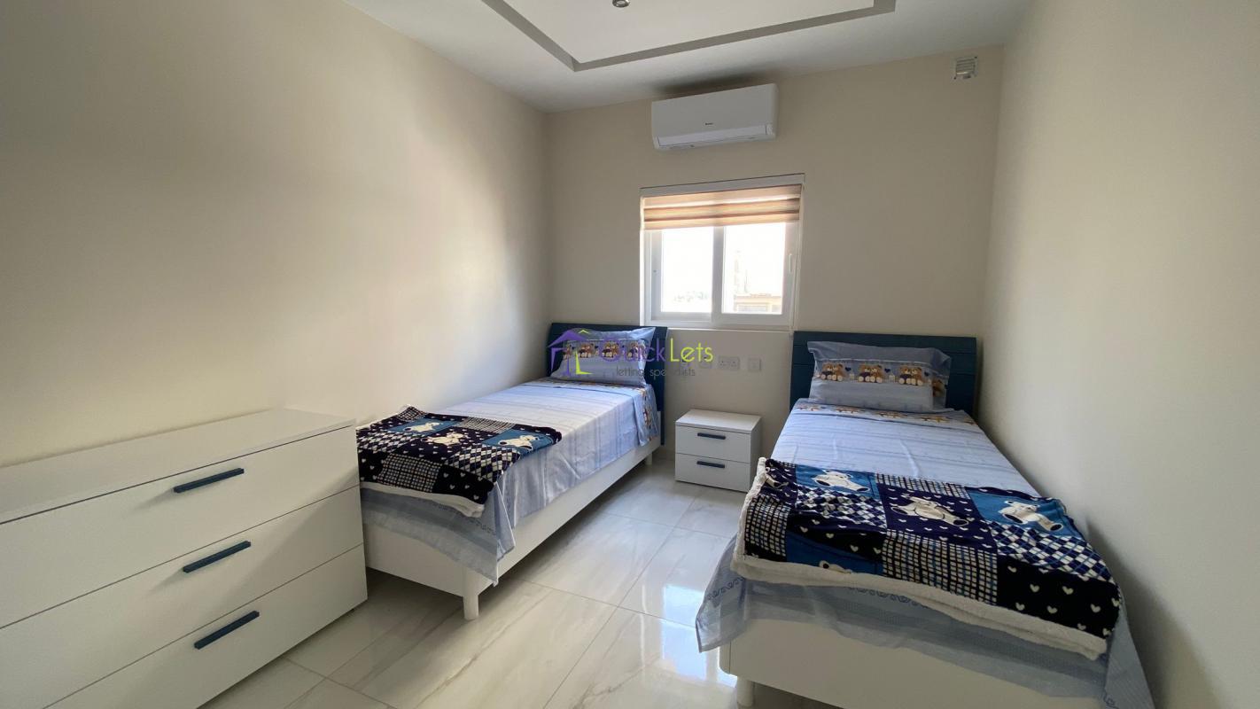 ZABBAR - New (2022) two-bedroom apartment in the heart of Zabbar, close to all needed amenities. The apartment is located on the third floor, the block is served by the lift. The property layout consists of an open-plan kitchen/living/dining area leading to the front balcony, the main bathroom with a bathtub, the main bedroom with a double bed and the shower en-suite, the spare bedroom with two single beds, the washroom with a washing machine and the tumble dryer, and a back balcony. This apartment is equipped with a television, fridge freezer, hood, hob, oven, water heaters, and insect screens, and is fully air-conditioned.