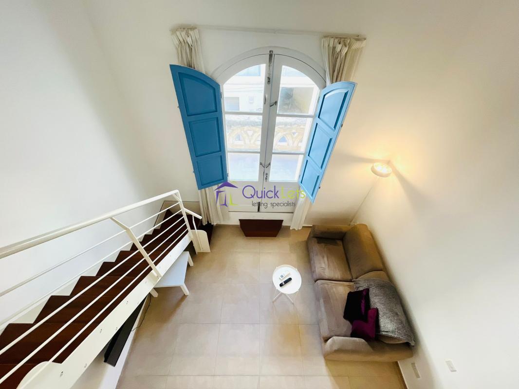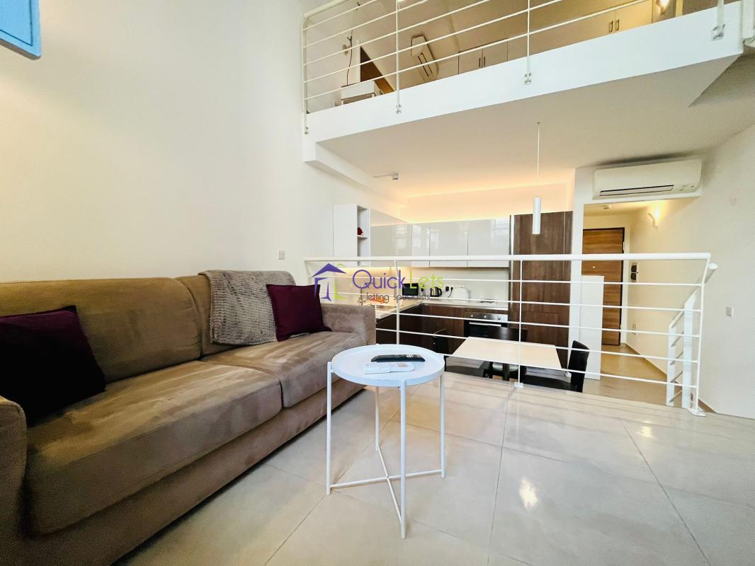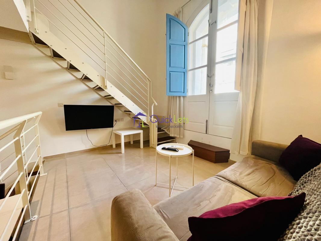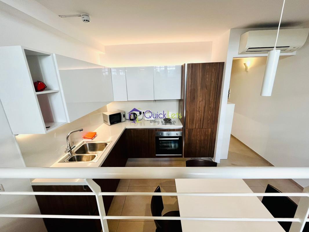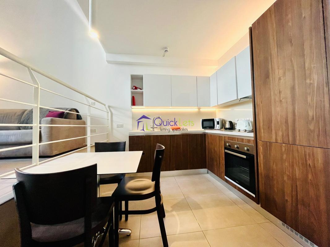 ST. JULIAN'S - A modern and freshly refurbished duplex one-bedroom apartment. The block has a lift. On the first level, there is a living/dining/kitchen area with a sofa-bed, a bathroom with a toilet and sink, the living area is supported by a stone balcony, the kitchen is equipped with a Fridge/Freezer, oven, double-burner cooker, hood, microwave, dishwasher, and necessary kitchen utensils. On the second level, which one can reach by a staircase, there is a bedroom with a double bed and a shower en-suite with a washing machine and tumble dryer. The apartment is fully airconditioned.