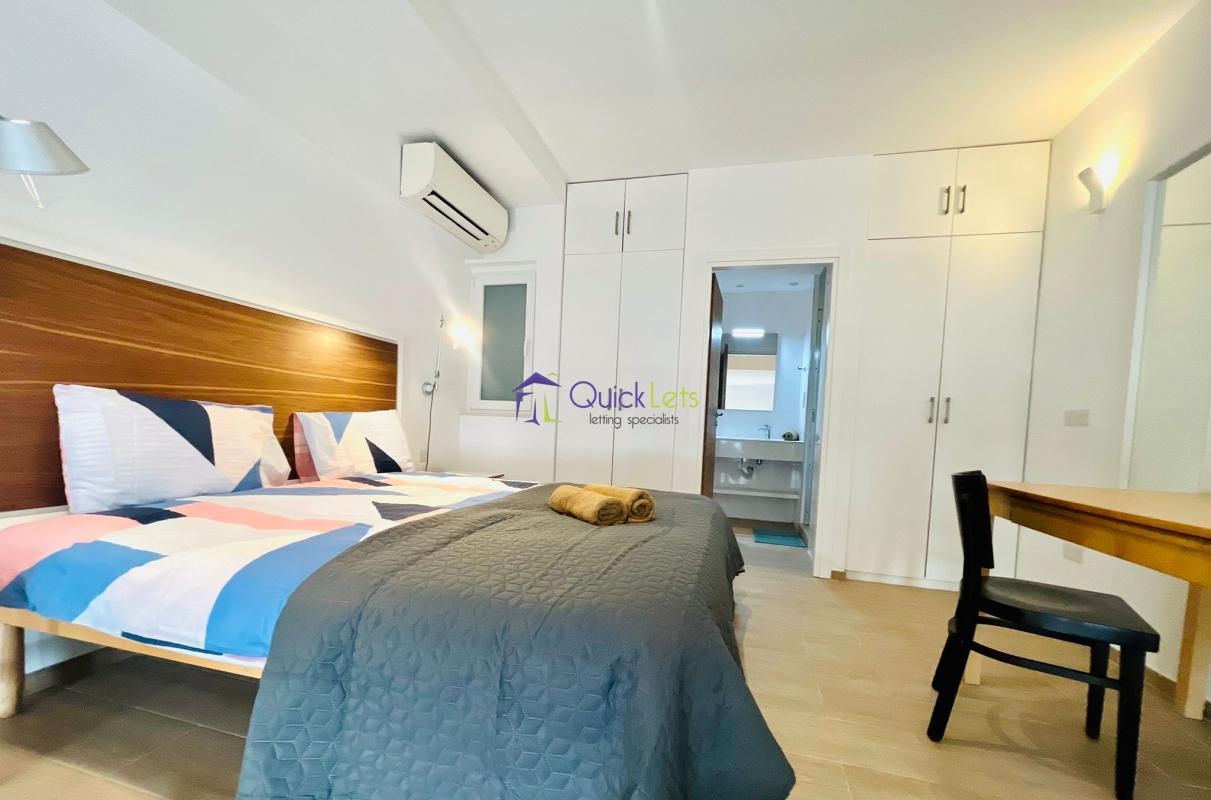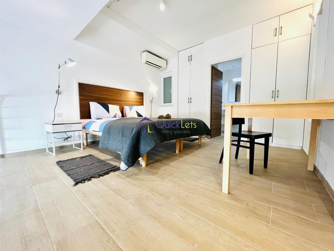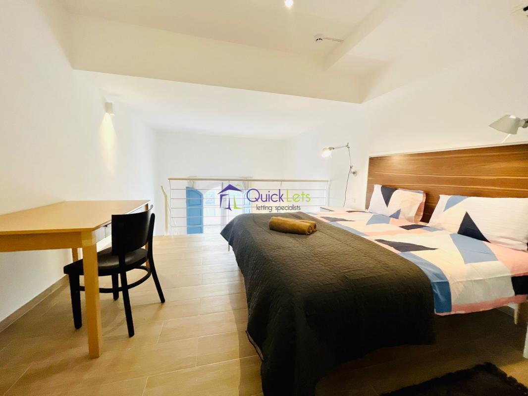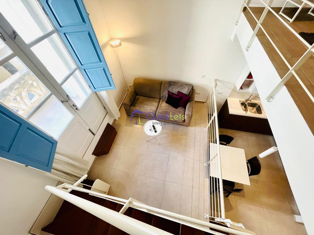 ST. JULIAN'S - A modern and freshly refurbished duplex one-bedroom apartment. The block has a lift. On the first level, there is a living/dining/kitchen area with a sofa-bed, a bathroom with a toilet and sink, the living area is supported by a stone balcony, the kitchen is equipped with a Fridge/Freezer, oven, double-burner cooker, hood, microwave, dishwasher, and necessary kitchen utensils. On the second level, which one can reach by a staircase, there is a bedroom with a double bed and a shower en-suite with a washing machine and tumble dryer. The apartment is fully airconditioned.