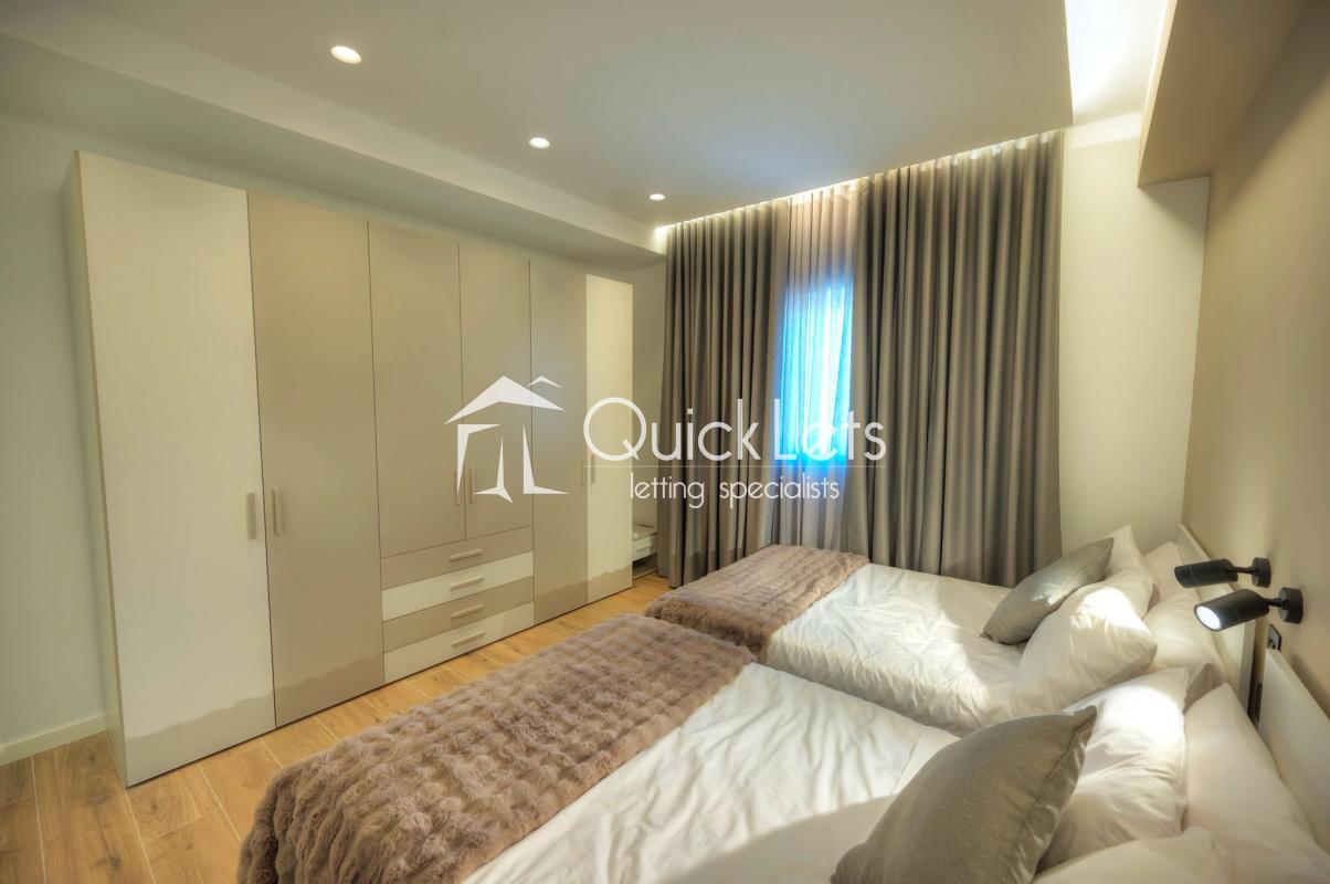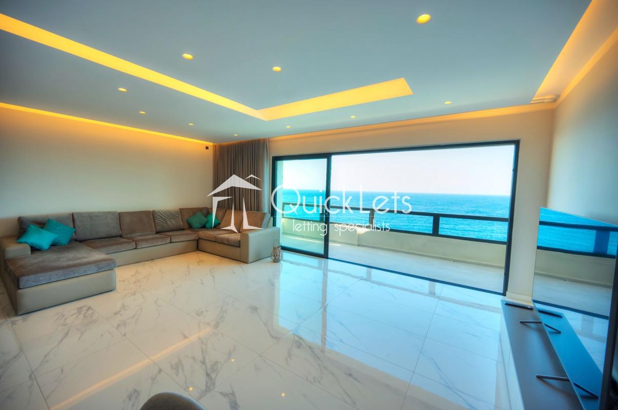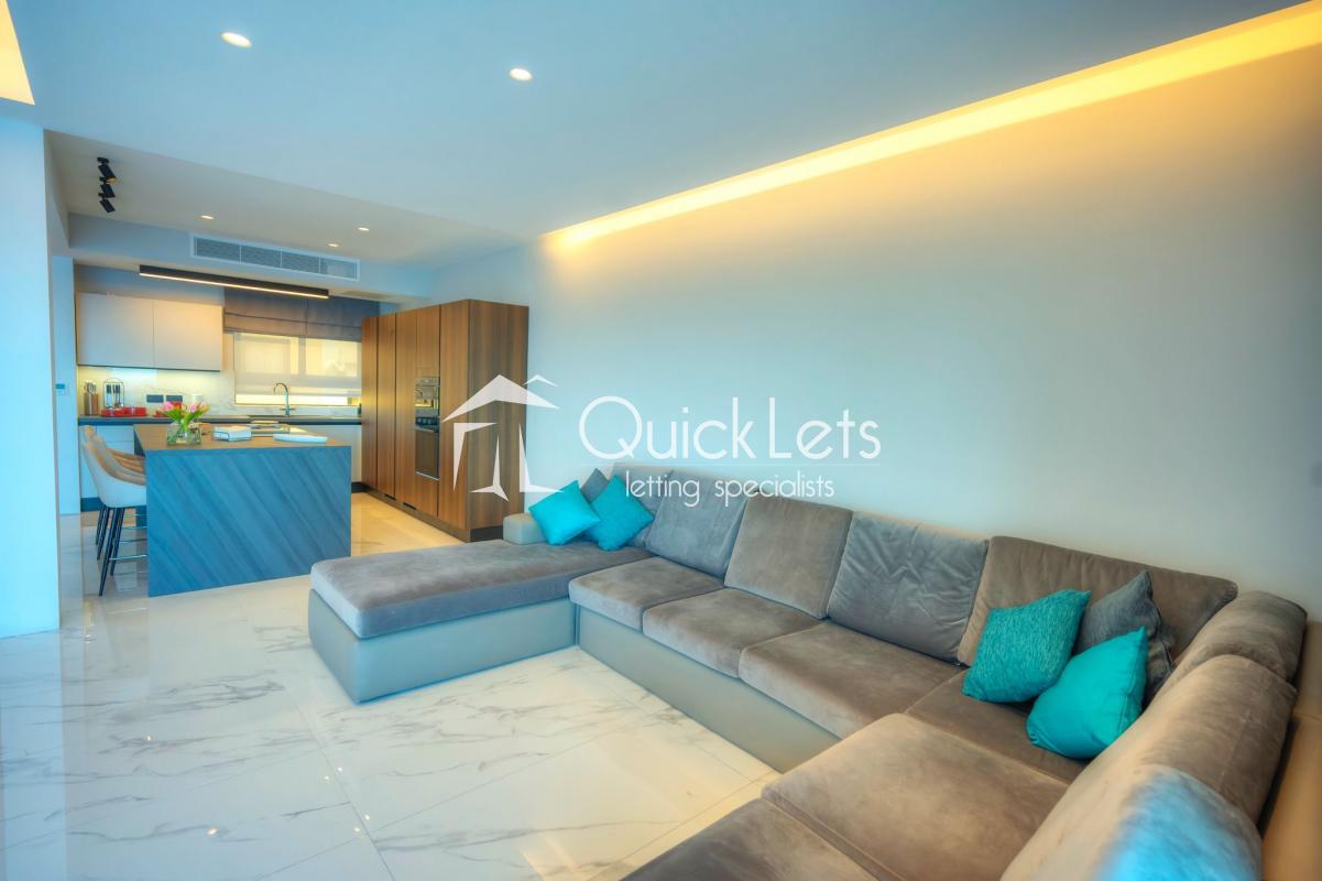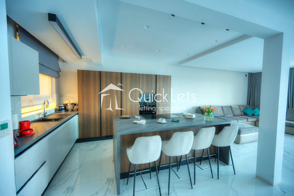 SLIEMA - A massive apartment - 210 sqm - on the seventh floor - lovely chic common area - four bedrooms, of which three are double with en-suite, the fourth bedroom has bunk beds for two kids. Guest toilet, washroom with washing machine and tumble dryer, study area, from the room is open plan with sitting area, dining area, living/TV area, and top-end kitchen with island/peninsula with stools. The front balcony has a dining table with chairs and two armchairs. The back balcony is ideal for a drying area. It has a designer finish throughout. Two-car garage space under the block with direct access from the elevator.