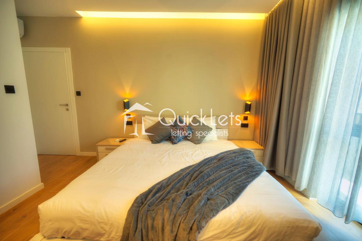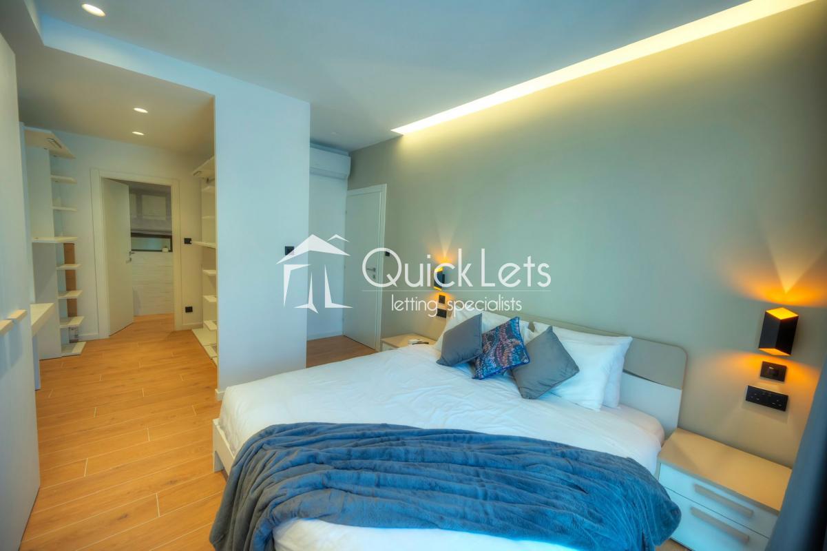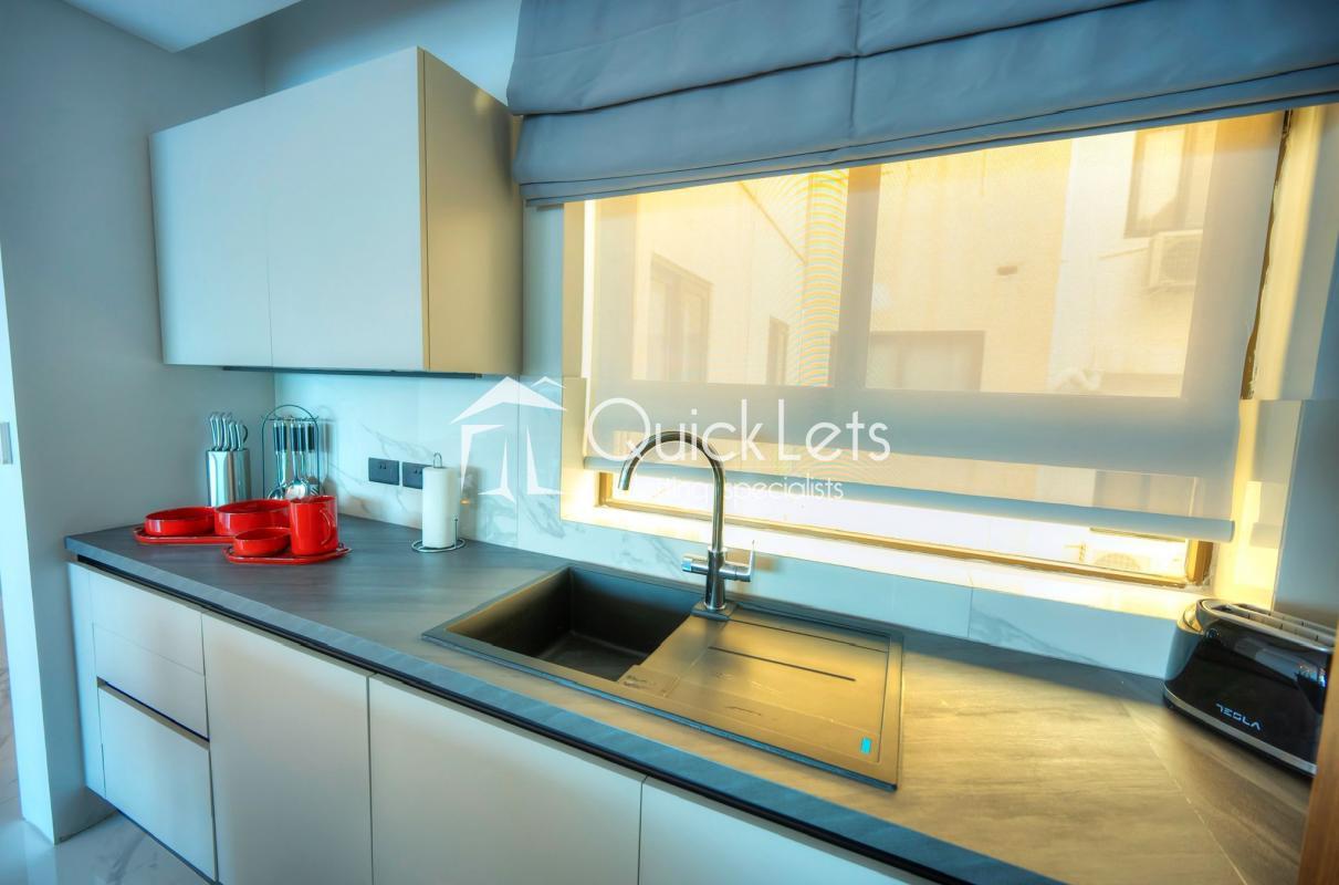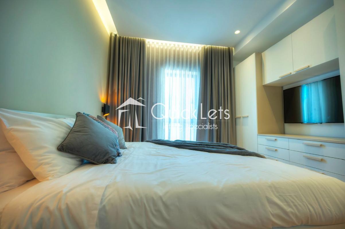 SLIEMA - A massive apartment - 210 sqm - on the seventh floor - lovely chic common area - four bedrooms, of which three are double with en-suite, the fourth bedroom has bunk beds for two kids. Guest toilet, washroom with washing machine and tumble dryer, study area, from the room is open plan with sitting area, dining area, living/TV area, and top-end kitchen with island/peninsula with stools. The front balcony has a dining table with chairs and two armchairs. The back balcony is ideal for a drying area. It has a designer finish throughout. Two-car garage space under the block with direct access from the elevator.
