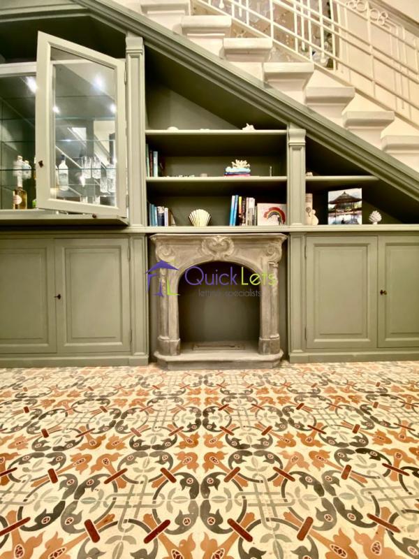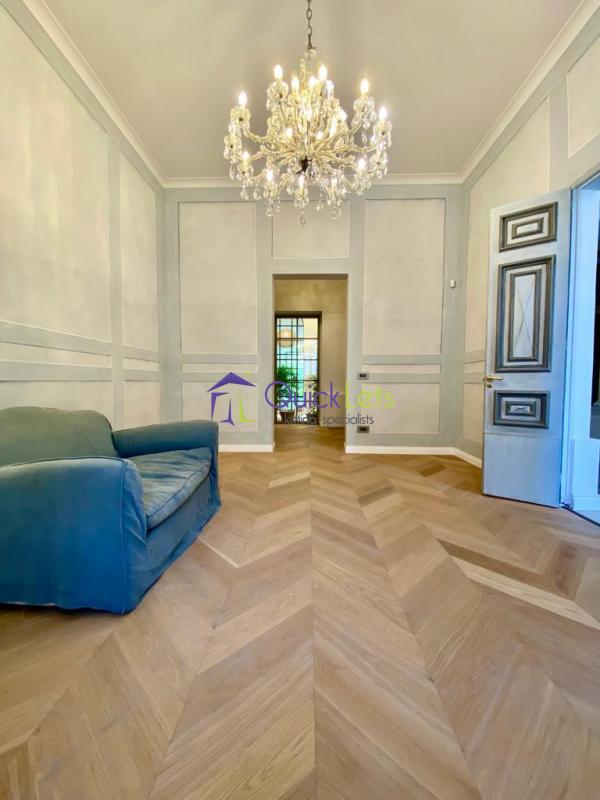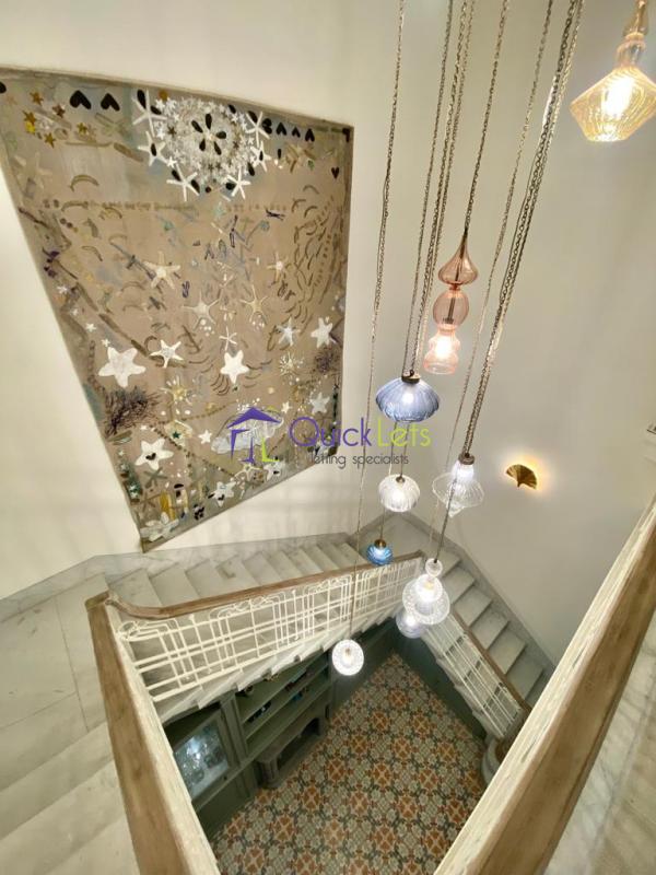 The floor plan of this gorgeous townhouse is spread over three levels and comprises seven bedrooms and eight bathrooms. Upon entrance, you are greeted by two large rooms on either side and by an arched hallway with marble columns which leads you into a magnificent open landing equipped with a functioning fireplace. Once there one will also find a small chapel which has been converted into a cloak/storage room and a lovely internal courtyard.