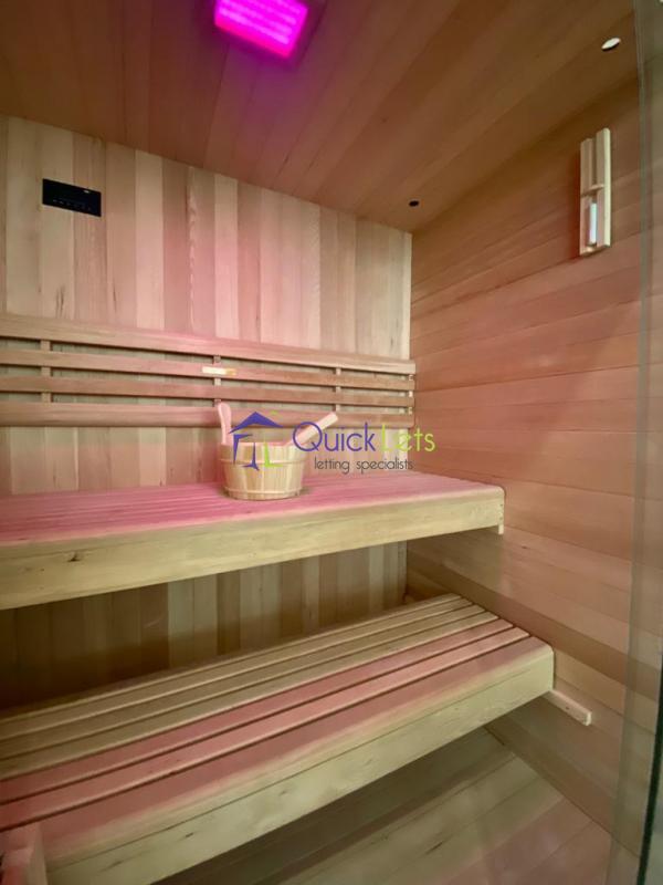 As you continue through the 1st floor, you will find a large open-plan setting which includes a fully-equipped chef-grade kitchen with top-of-the-range appliances and a large pantry, which combines with spacious living and dining area which leads out to an adjacent oasis of a garden with a lovely swimming pool. Towards the back of the garden, one will find a room which is fitted with a large heated Finnish hot tub and Swedish infrared sauna, and a bathroom with a shower.