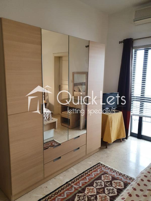 SLIEMA: A room in a beautiful seafront apartment enjoying panoramic views from a large terrace, having an open plan lounge/dining room, separate kitchen, three bedrooms, two bathrooms main with en-suite, fully equipped and served with lift. This room is complete with a balcony and en-suite.
