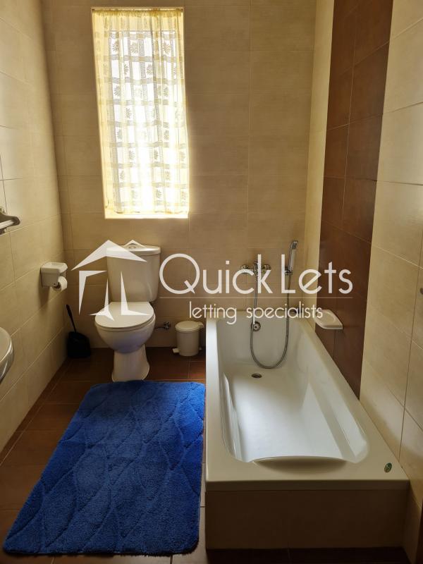 The property features a fully equipped open-plan kitchen/ living area & a front balcony. A wide corridor leads to the main bathroom with a bath tub, the master bedroom with an en-suite, the second bedroom with two single beds & finally the third room, which can be converted into another bedroom or a study. The internal yard & a spacious back terrace provide additional outdoor space.