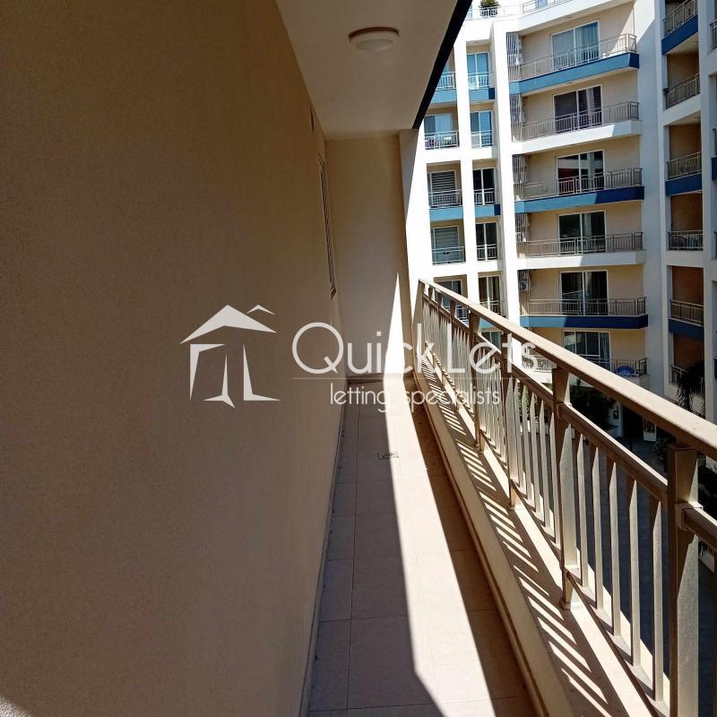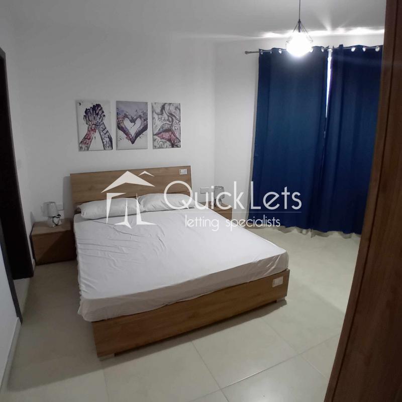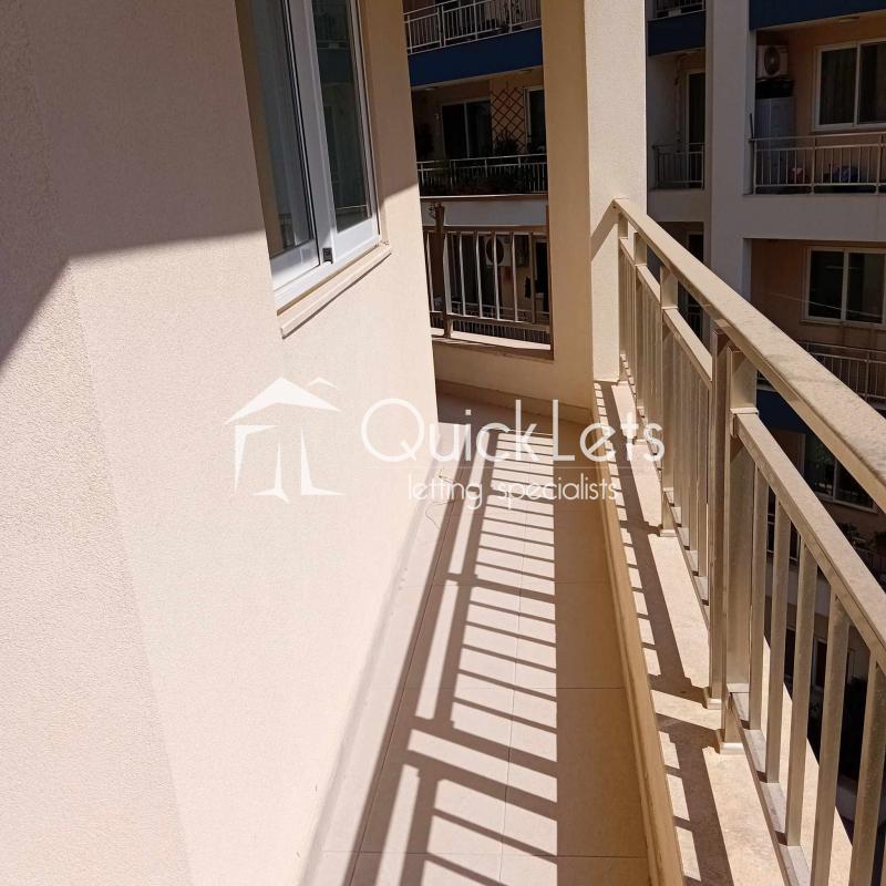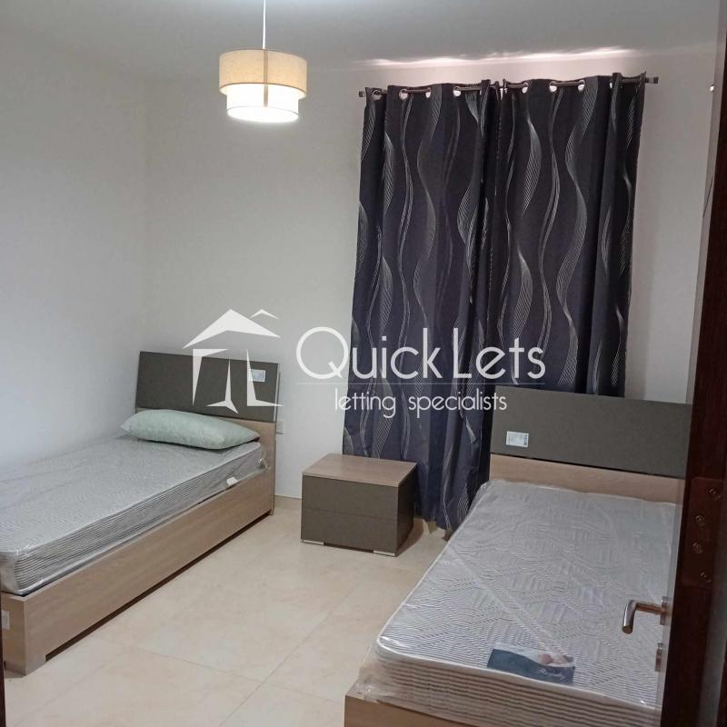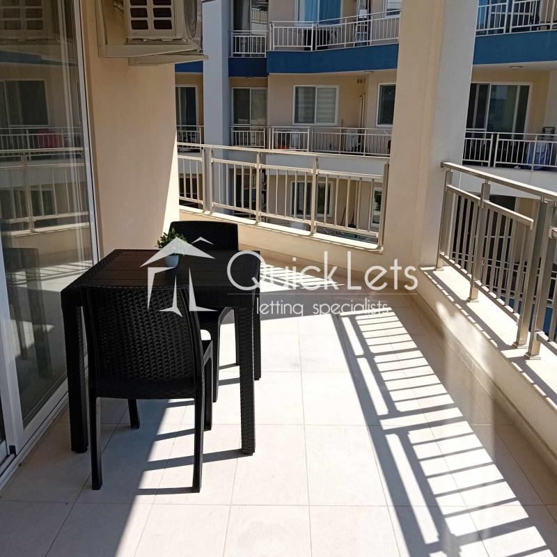 The two-bedroom apartment consists of an open plan with a kitchen, dining room, living room, and terrace. There is a bathroom, a master bedroom with a double bed and ensuite (bathroom), and a second bedroom with two single beds. The apartment is located in a nice area, near butchers, supermarkets and restaurants