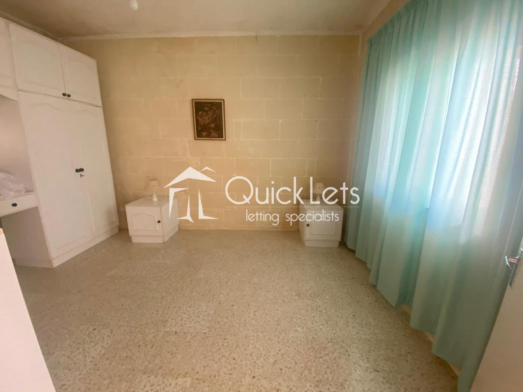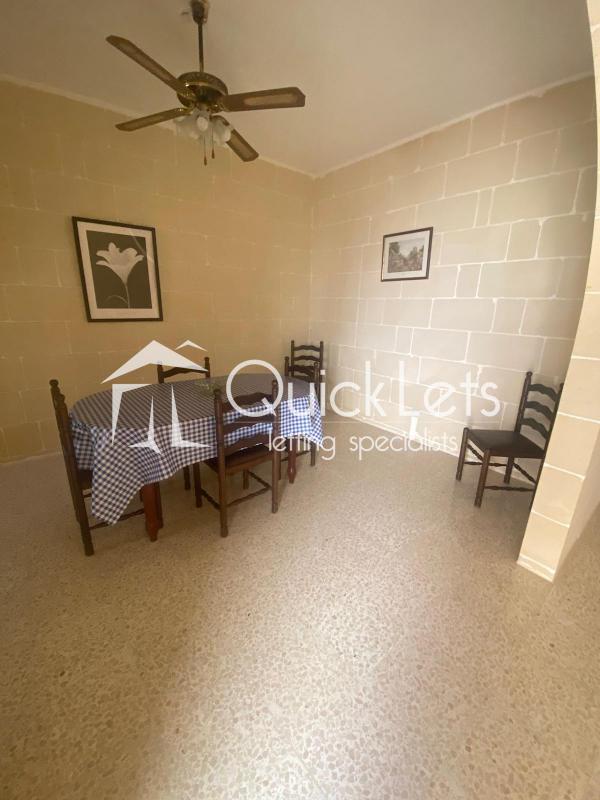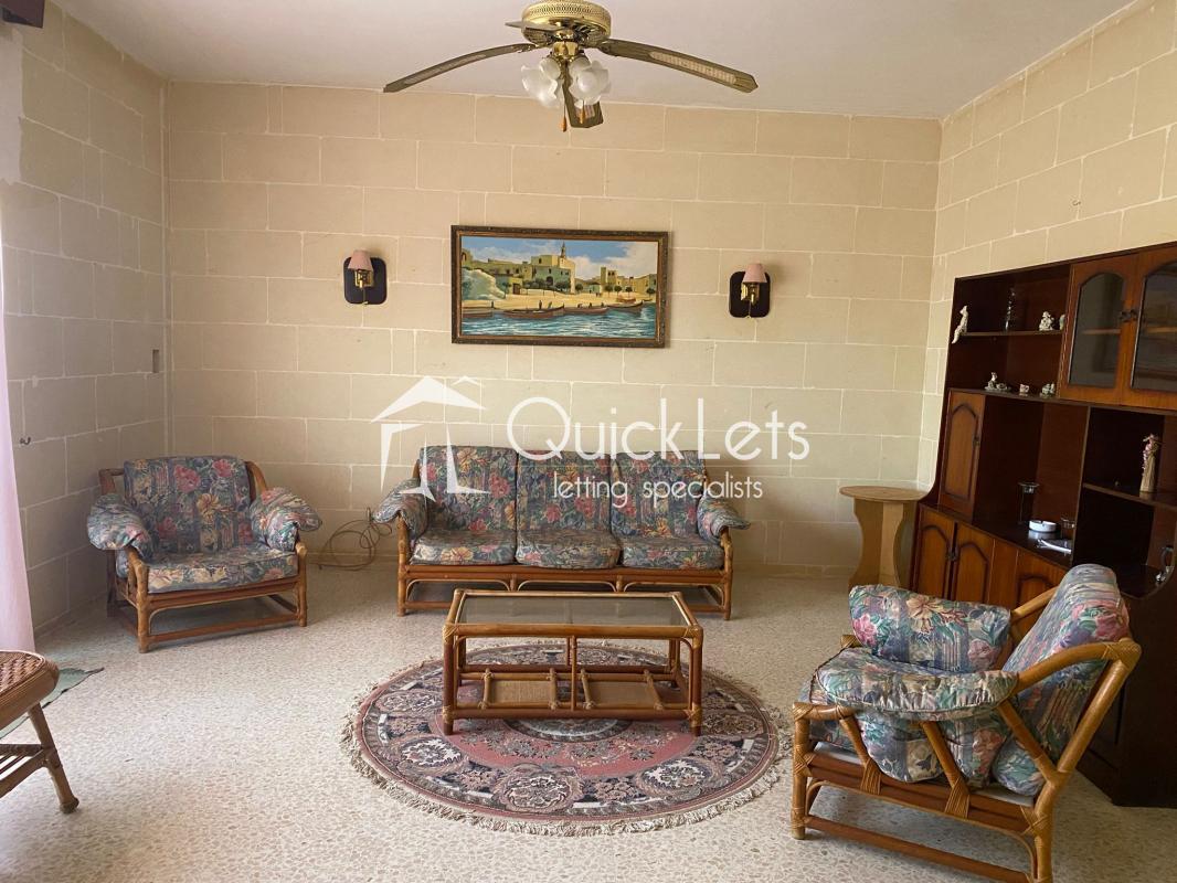 SANNAT, Gozo - Furnished three-bedroom apartment situated on the first floor. The layout consists of a Kitchen and Dining including appliances. Sitting Room, and three bedrooms. The main bedroom with double bed and another with single beds, while the third bedroom is left unfurnished and could be used as a study room. Very large backyard. Close to all Amenities - Walk in distance to Supermarkets, Pharmacy, School, Bus Stop.