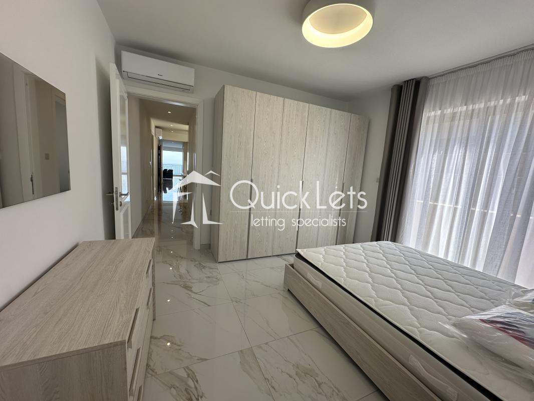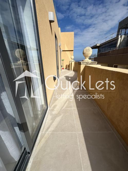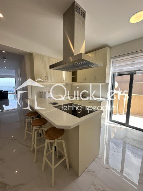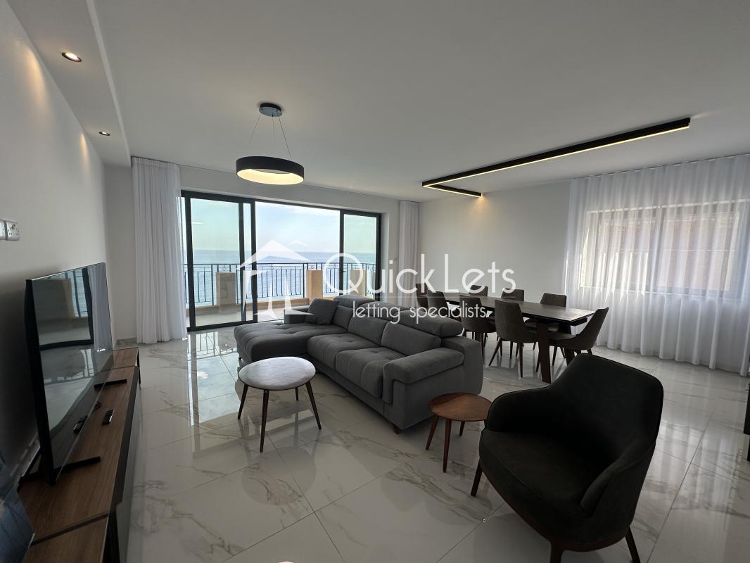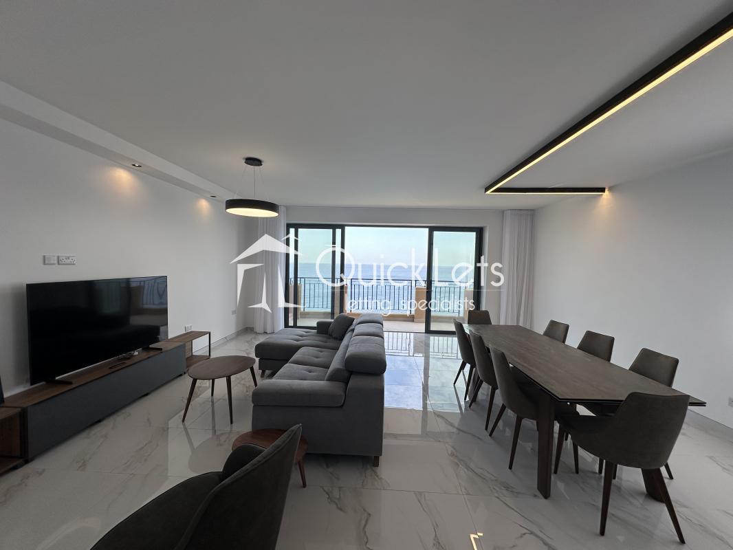 SLIEMA - Brand new (November 2024) seafront corner apartment of three double bedrooms with stunning unobstructed views on the eighth floor. The apartment is highly finished and furnished and consists of an open dining/living area plan with a huge terrace, a kitchen with access to the side terrace, a main bedroom with an en-suite, one double bedroom, one single bedroom, and a main bathroom. All bedrooms have access to the side terrace with sea views.