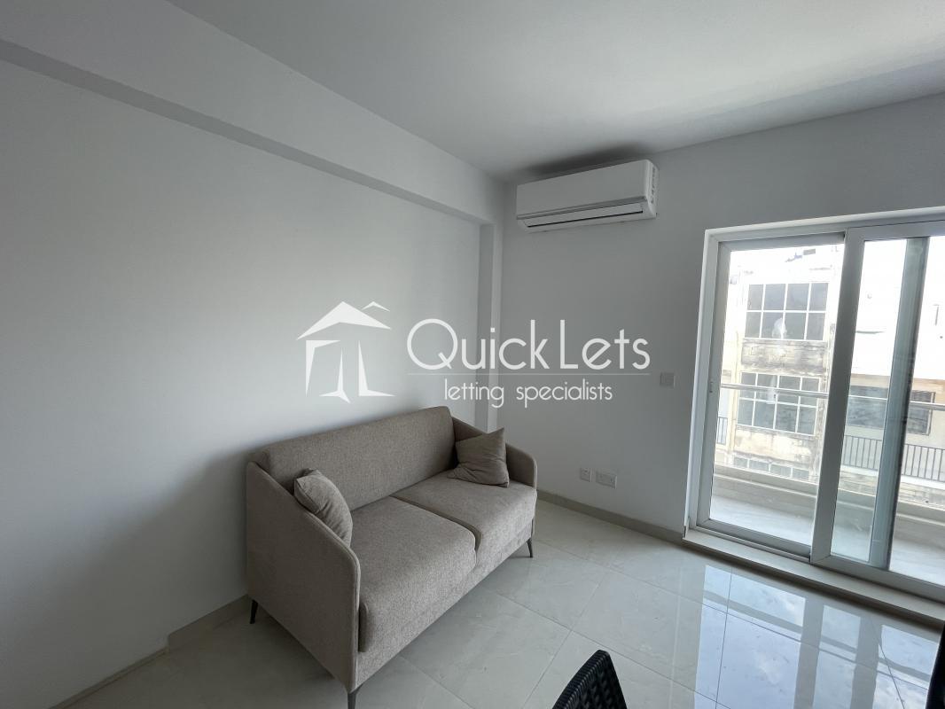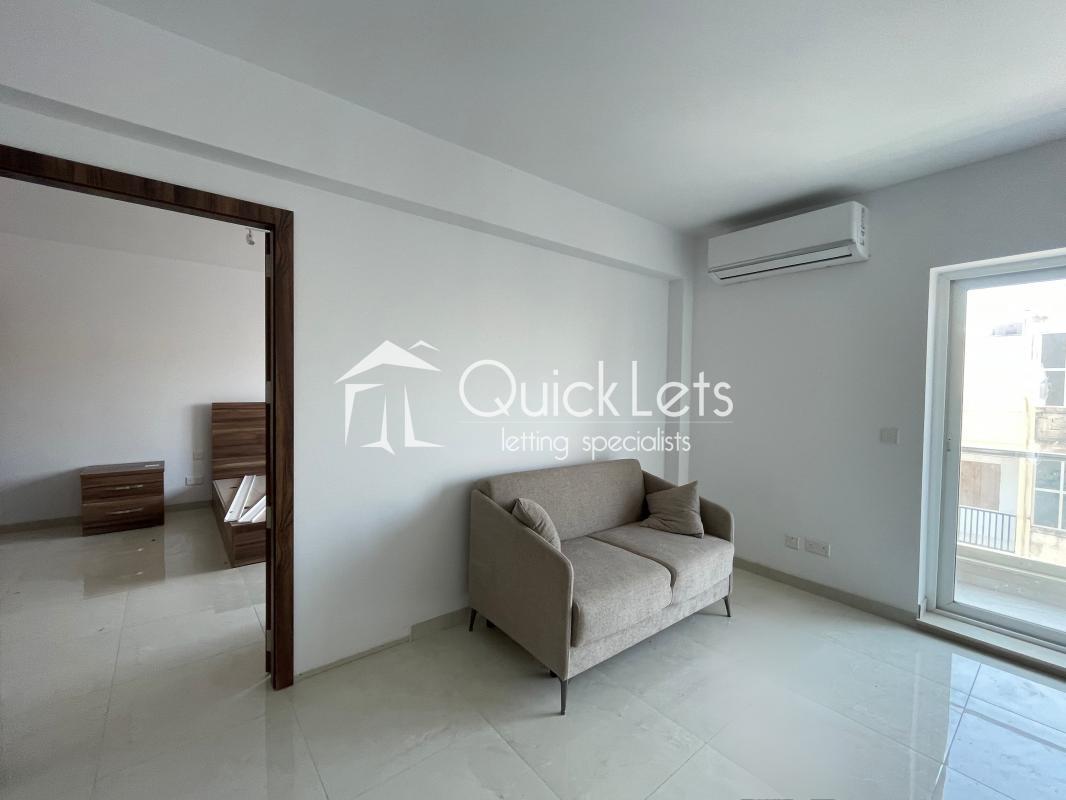 The property features a bright and modern living and dining area with a comfortable sofa, air conditioning, and access to a balcony with open views. The kitchen is separate from the living space, providing a practical layout.