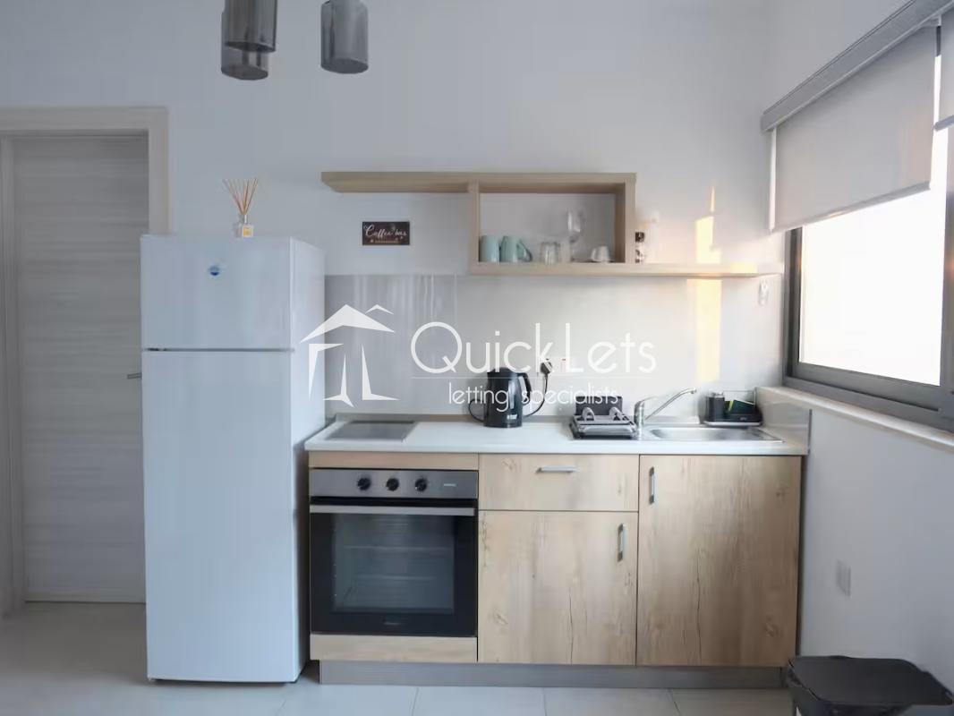 The open-plan living area connects seamlessly to a compact yet fully equipped kitchen with minimalist cabinetry and modern appliances. The bedroom provides a cozy retreat, complete with built-in storage and subtle sea views. The bathroom is bright and contemporary, finished with elegant fixtures and a walk-in shower.