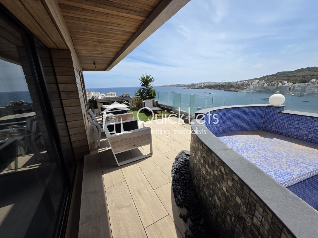 Experience luxury living in this ultra-modern seafront 300 sqm penthouse in Xemxija, available for long-term rent from October 2025. Boasting three spacious bedrooms, three bathrooms, and two expansive terraces – one at the back and one at the front, with a private pool overlooking the stunning Xemxija Bay. The open layout and breathtaking sea views make this a truly unique property. Ideal for those seeking space, comfort, and a touch of elegance by the sea. Please note: the property is not fully finished. Internal lift. Garage included. Don’t miss this rare opportunity to live in style and serenity.