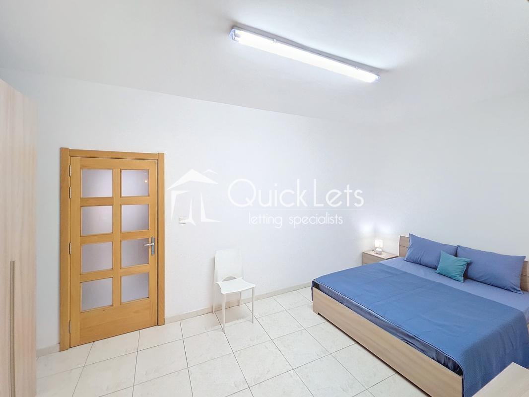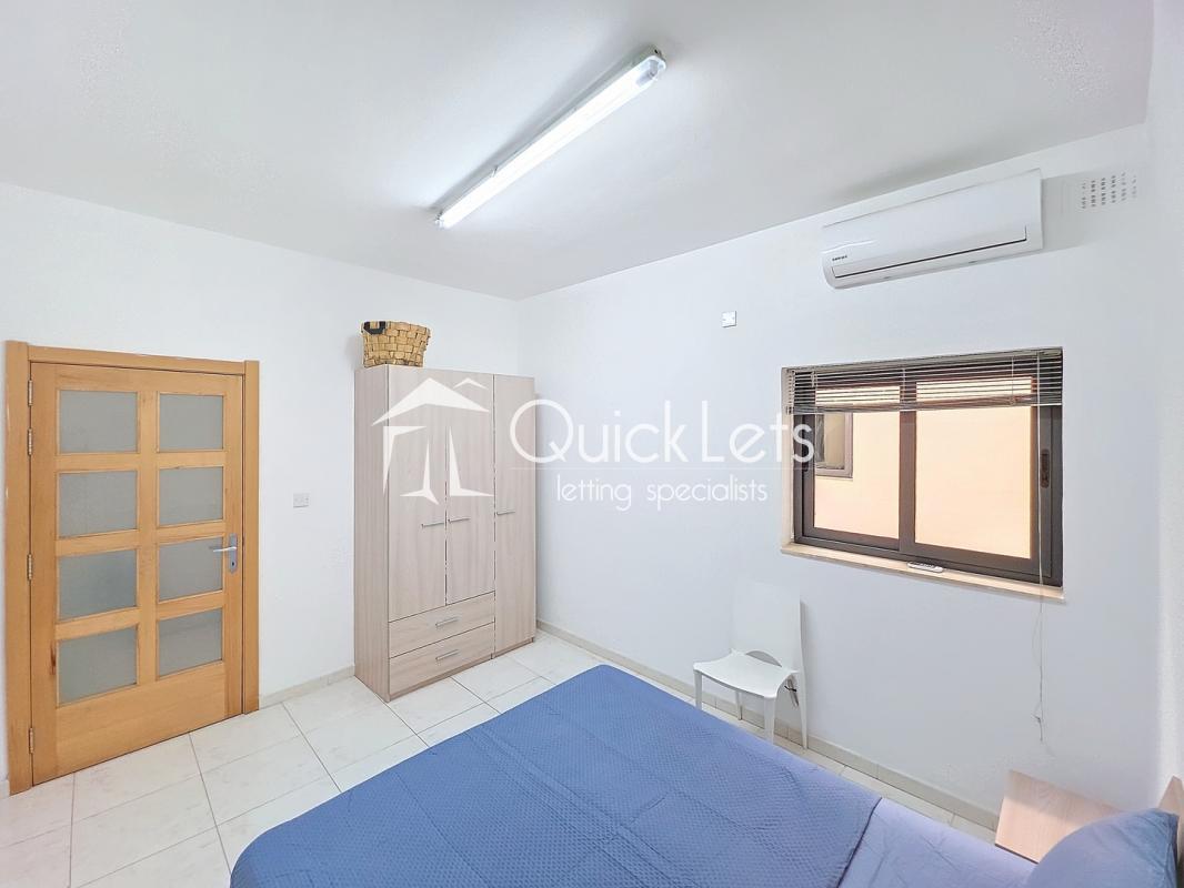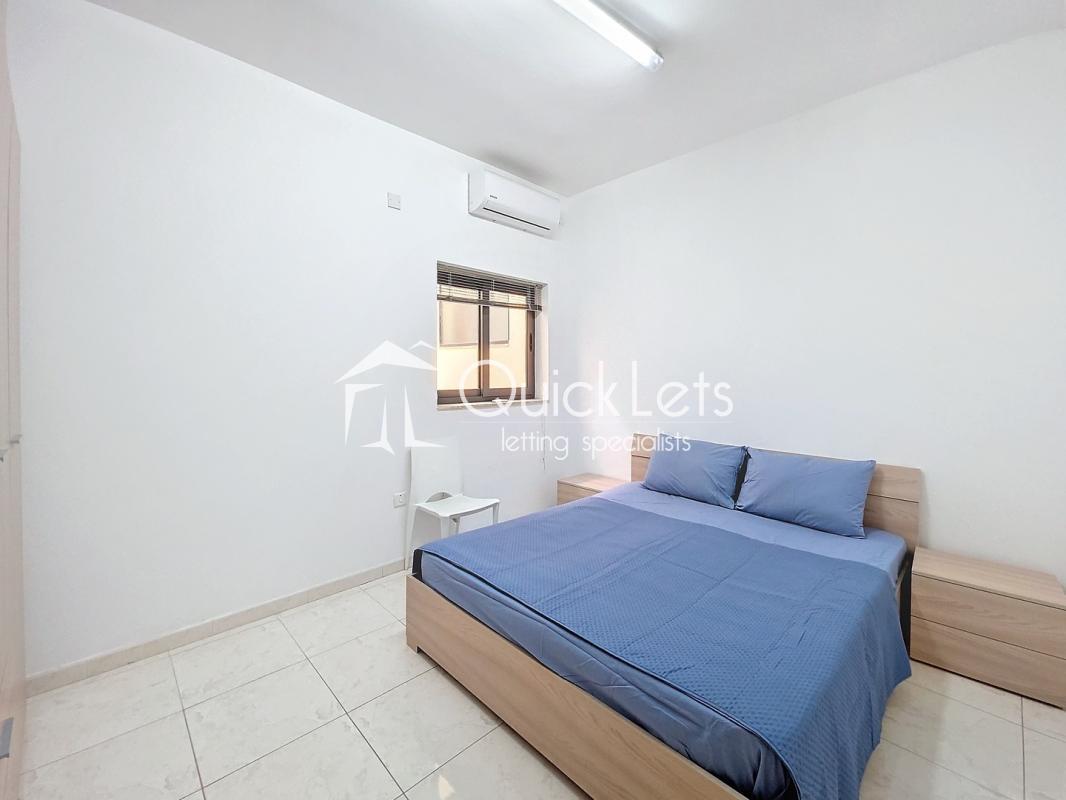 [BIRKIRKARA] This cozy bedroom in a three-bedroom apartment features a tranquil ambiance, with soft, neutral tones and natural light streaming in through large windows.