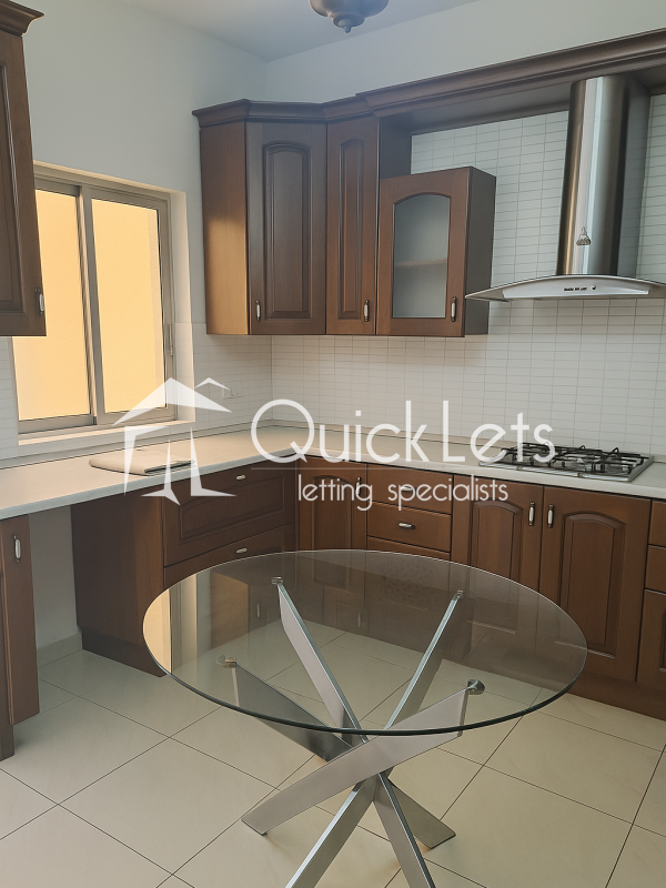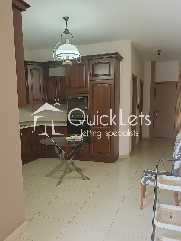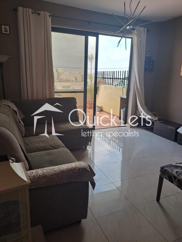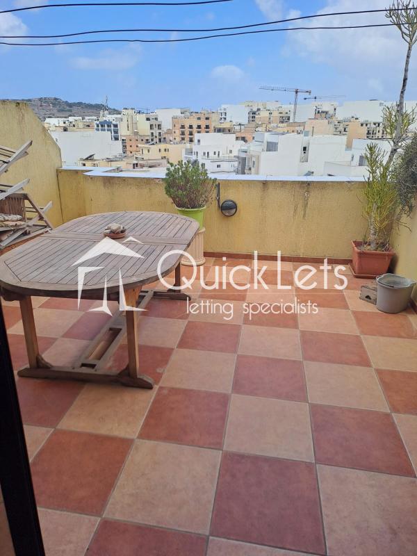 Refurbished Penthouse located in Qawra. This property consists of a front terrace, a fully equipped kitchen, a living room, a dining room with AC, two bedrooms, one main bedroom with an ensuite and AC, and a second bedroom with one single bed + ceiling fan.