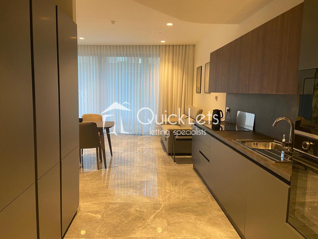 Step inside to find sleek, open-plan interiors flooded with natural light through floor-to-ceiling windows. The living area seamlessly connects to a private balcony, offering breathtaking city and sea views. The fully equipped designer kitchen features high-end appliances, elegant cabinetry, and premium finishes—perfect for both daily living and entertaining.