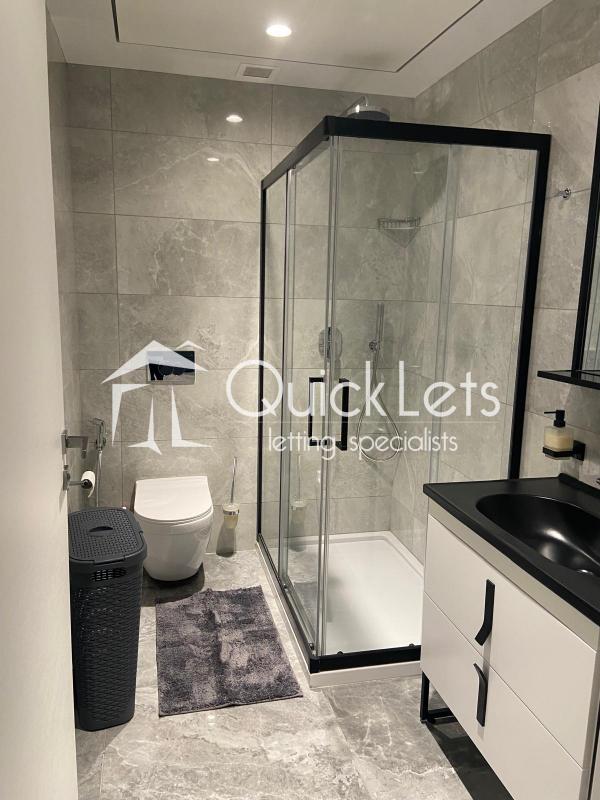 The spacious bedroom offers built-in wardrobes and a serene retreat from the vibrant city below. The bathroom showcases a minimalist design with marble detailing, a walk-in rainfall shower, and luxury fixtures.