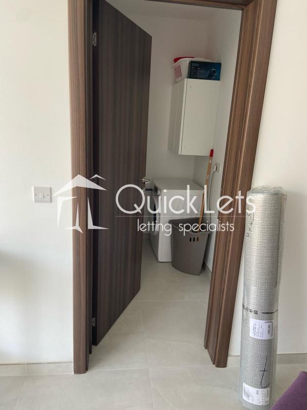 The modern kitchen comes fully equipped with all appliances, including a microwave and dishwasher. A dedicated washroom is fitted with a washing machine.