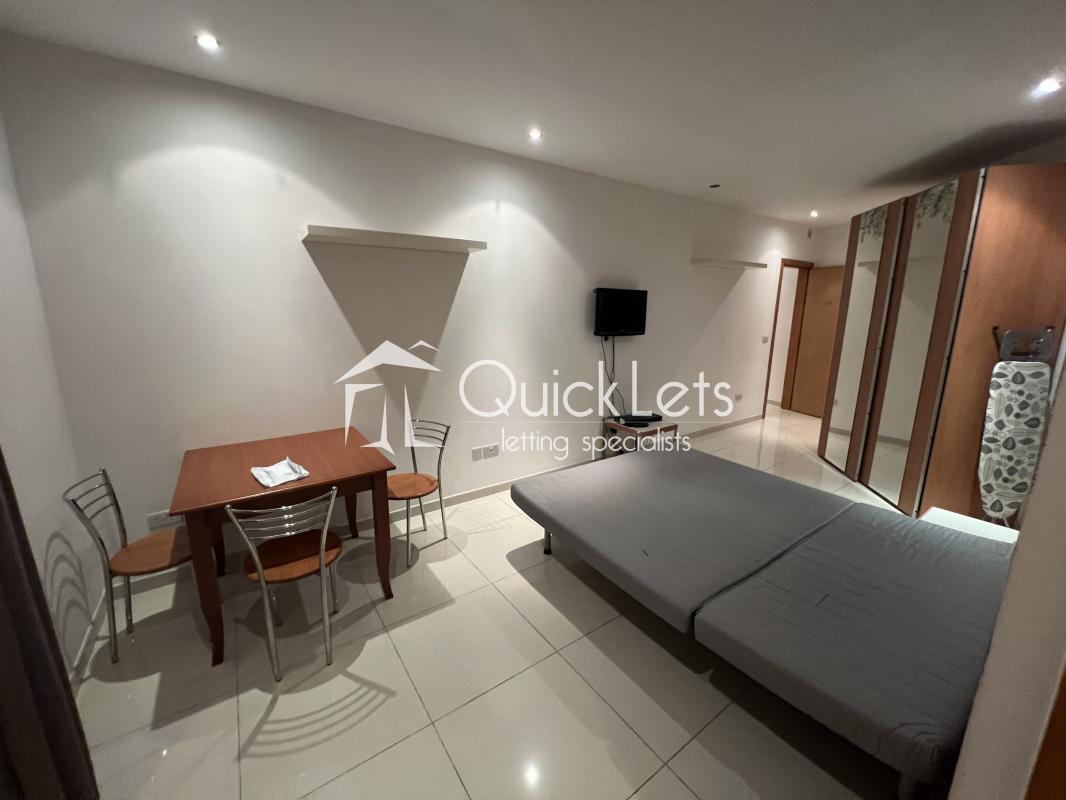 The space includes an open-plan layout with a combined living and sleeping area, a small kitchenette, and a bathroom. It comes furnished and is situated close to shops, bus routes, and the seafront, making it a good option for anyone looking for an affordable and well-located place in Sliema.
