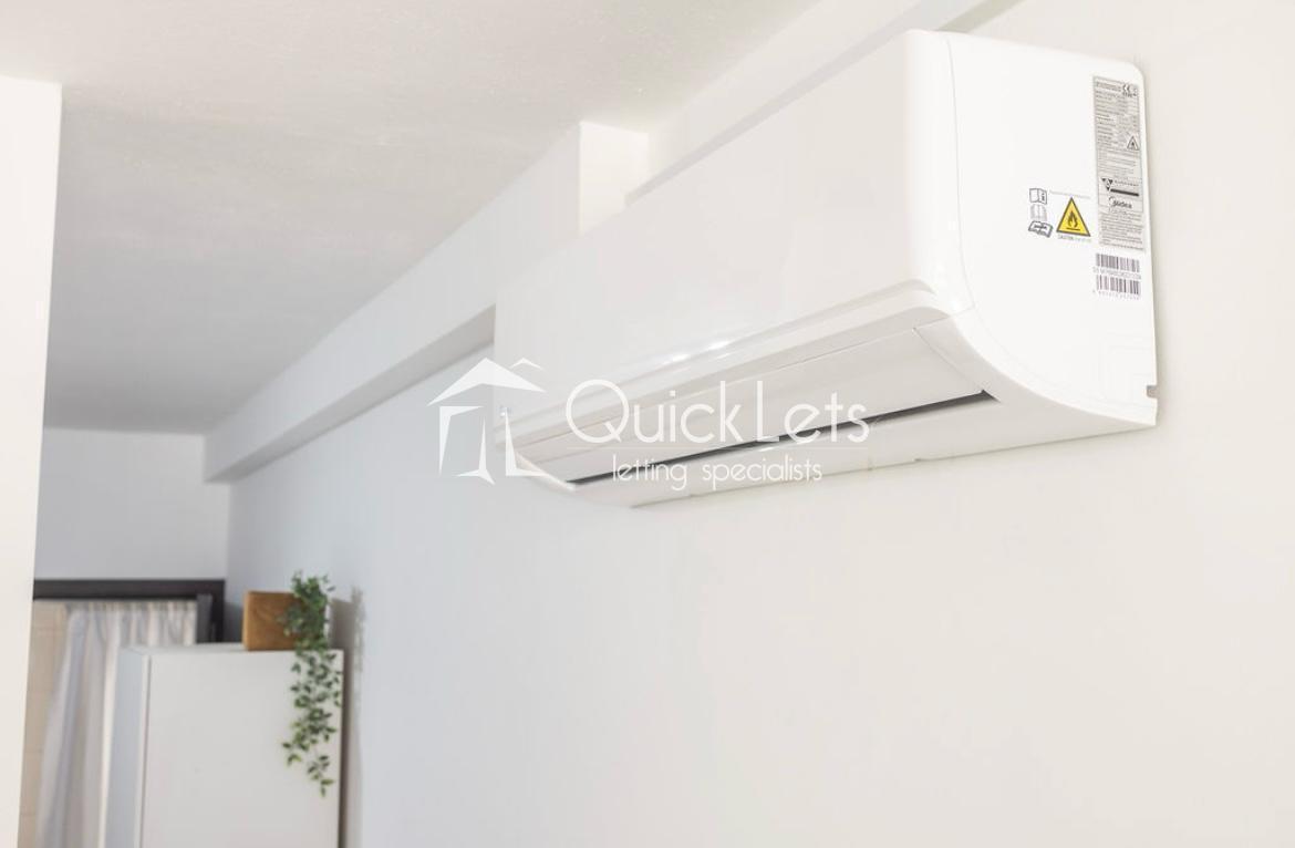 It features a bright living area with air conditioning, a kitchen with a dining space, a spacious bedroom, and a modern bathroom.