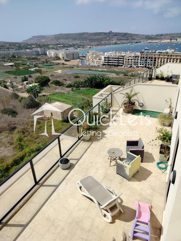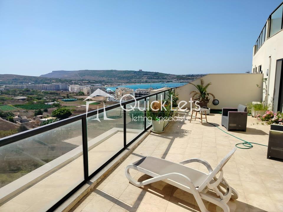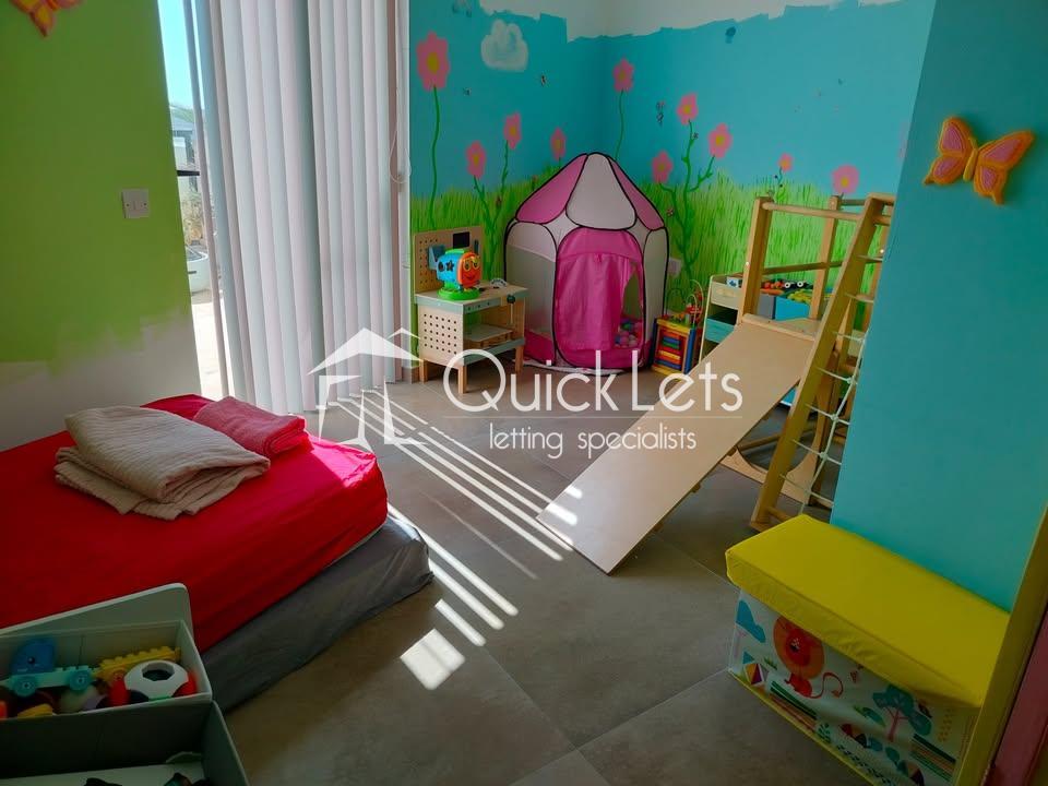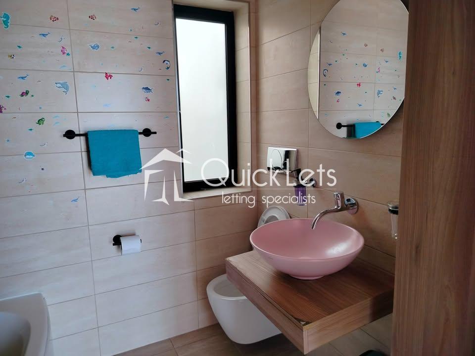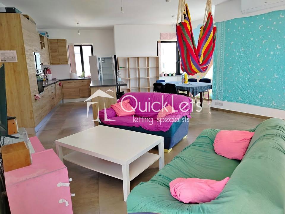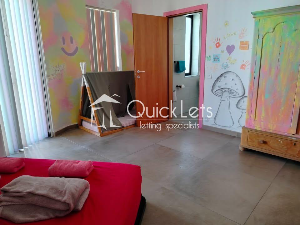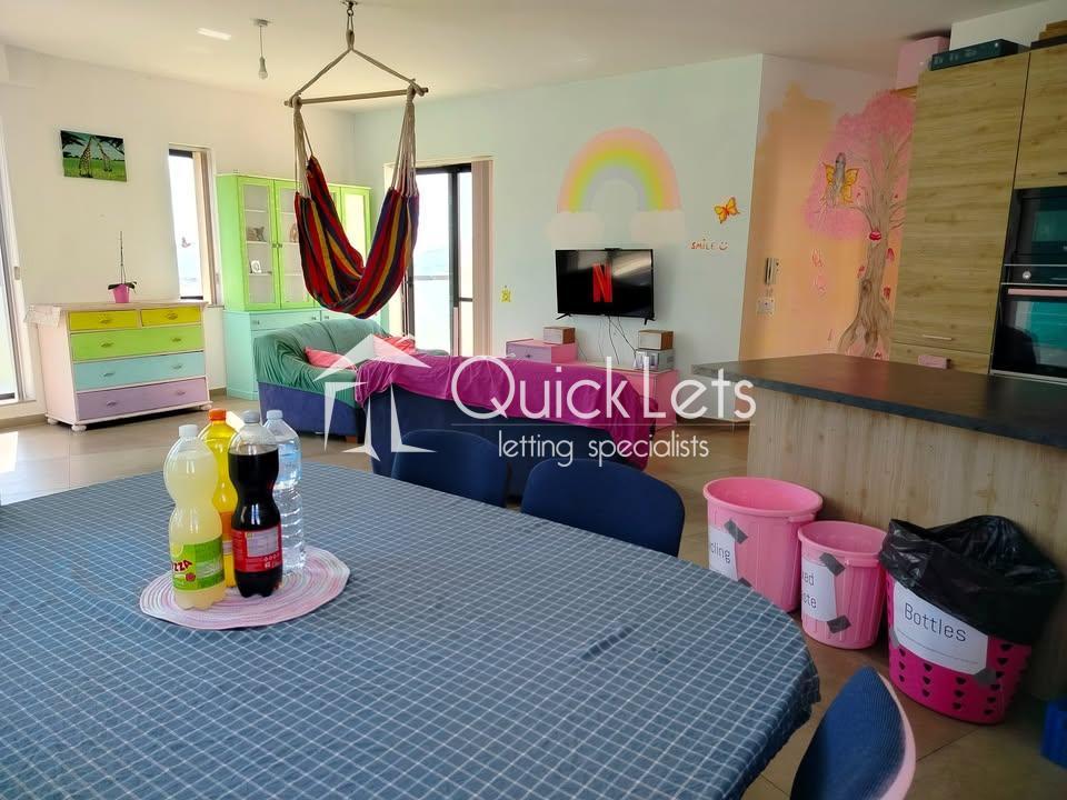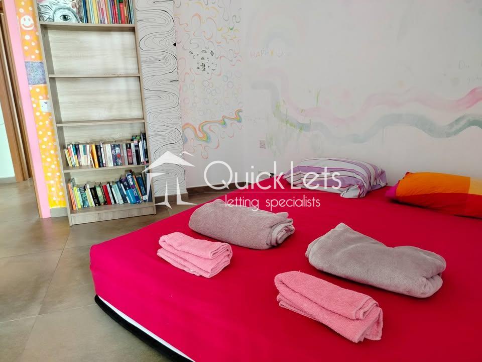This colourful three-bedroom penthouse (plus study) in Mellieħa offers a magical pink-themed interior with fairy-inspired wall art and abundant natural light from 15 windows and glass doors facing east, south, and west. Located in Għadira, it enjoys beautiful sea views, countryside scenery, and a clear view of the Mellieħa Parish Church. Just three minutes from the Luna bus stop, five minutes from the sea, and ten minutes from Għadira Bay, the location is ideal. The home includes air conditioning, free high-speed WiFi, and a spacious open-plan kitchen, dining, and living area with a 50" smart TV. Pet-friendly too