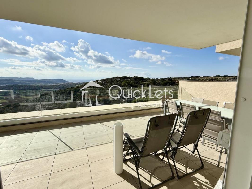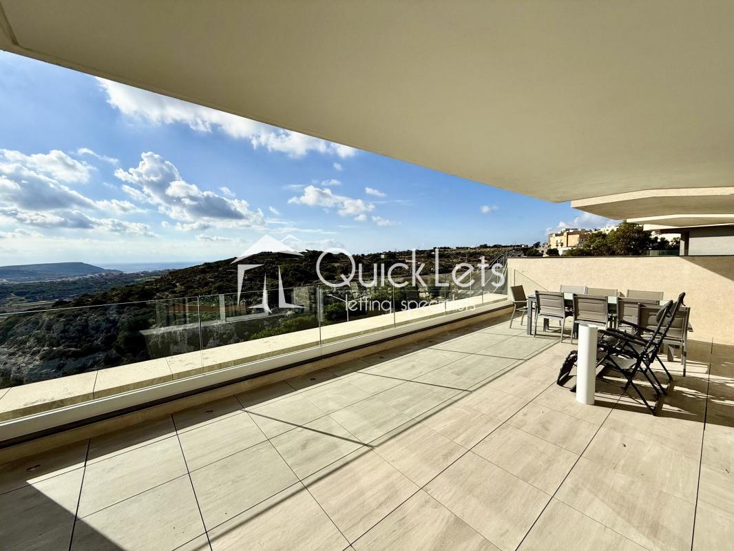 Situated on the third floor, this stylish property features a bright open-plan kitchen, living, and dining area, fully fitted with high-end appliances, a wine cooler, an electric fireplace, and all modern comforts. The dining area opens onto a spacious front terrace boasting breathtaking 180-degree valley and sea views, making it ideal for entertaining family and friends.