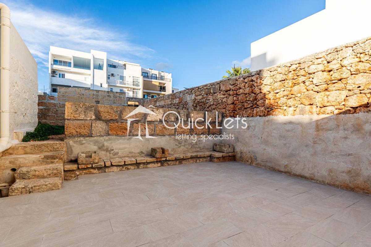 Adjacent to the living area is an internal courtyard that brings in plenty of natural light and is ideal for a barbecue area. Beyond this, the property also boasts a larger backyard, partially divided by a traditional rubble wall. A permit is already in hand for the installation of a pool and sun-lounger area.