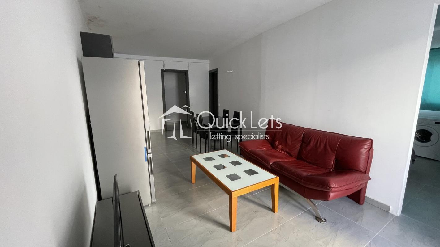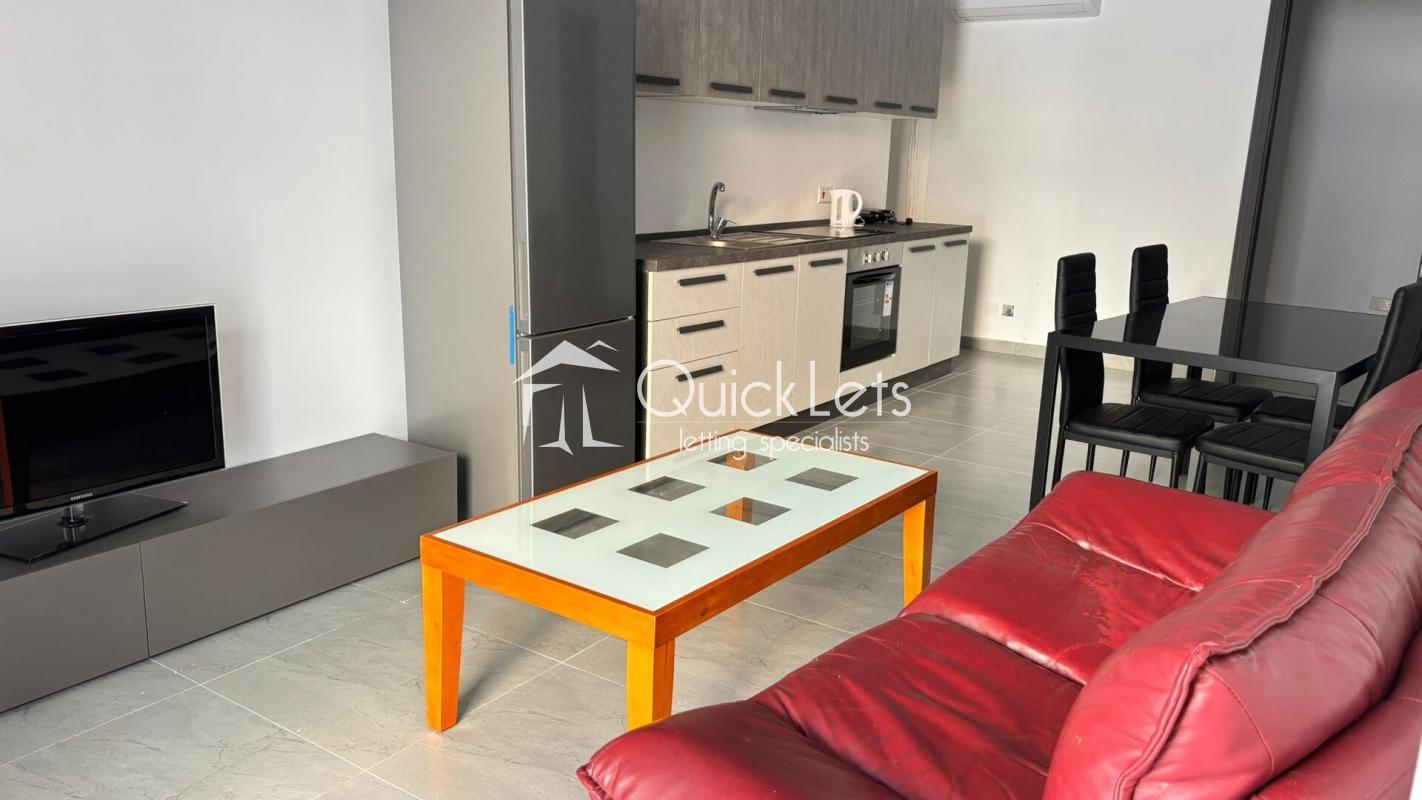 This ground floor apartment in Birkirkara offers comfortable living close to local amenities. The open-plan living and dining area features a sofa, coffee table, dining table with chairs, and LCD TV. The fully equipped kitchen includes a refrigerator, oven, stove, sink, and ample cabinet storage.