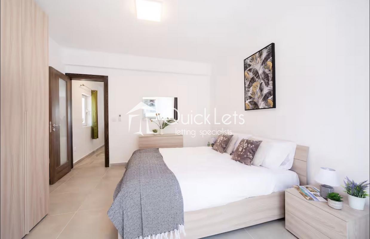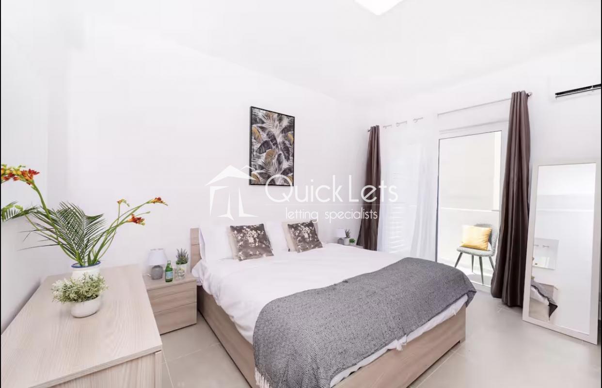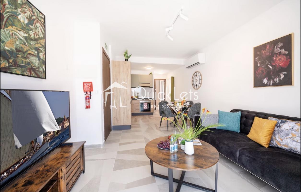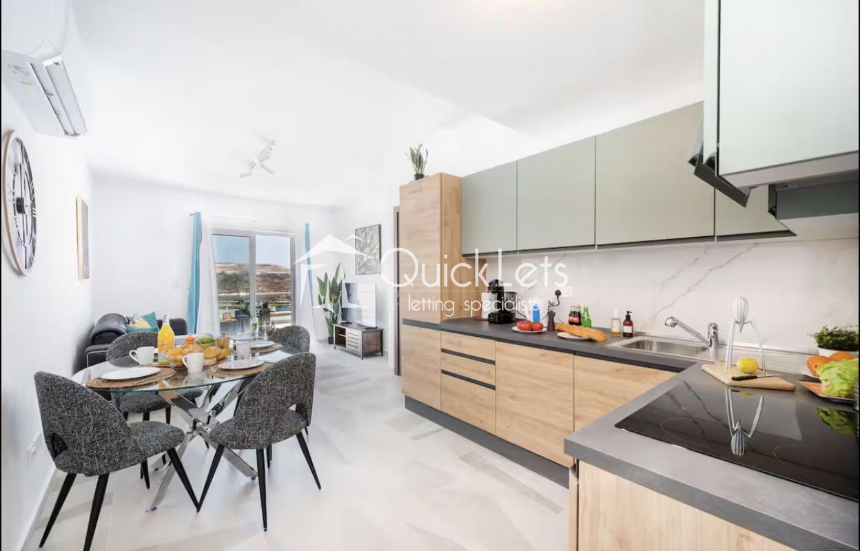 QAWRA – Modern 1-bedroom penthouse finished to a high standard, featuring a bright open-plan kitchen/living/dining area and stylish furniture throughout. Large sliding doors open onto an incredible terrace with stunning open sea views, perfect for relaxing, entertaining, or enjoying the sunset.