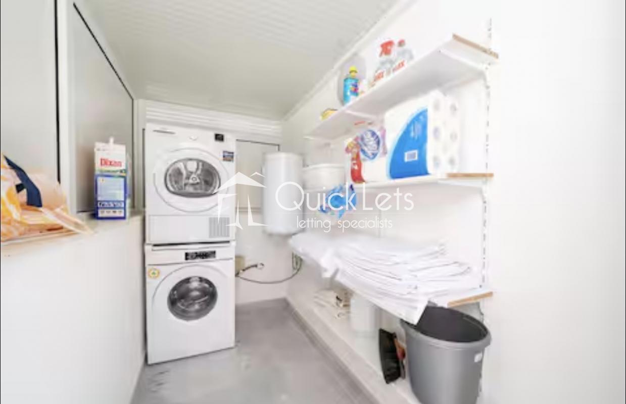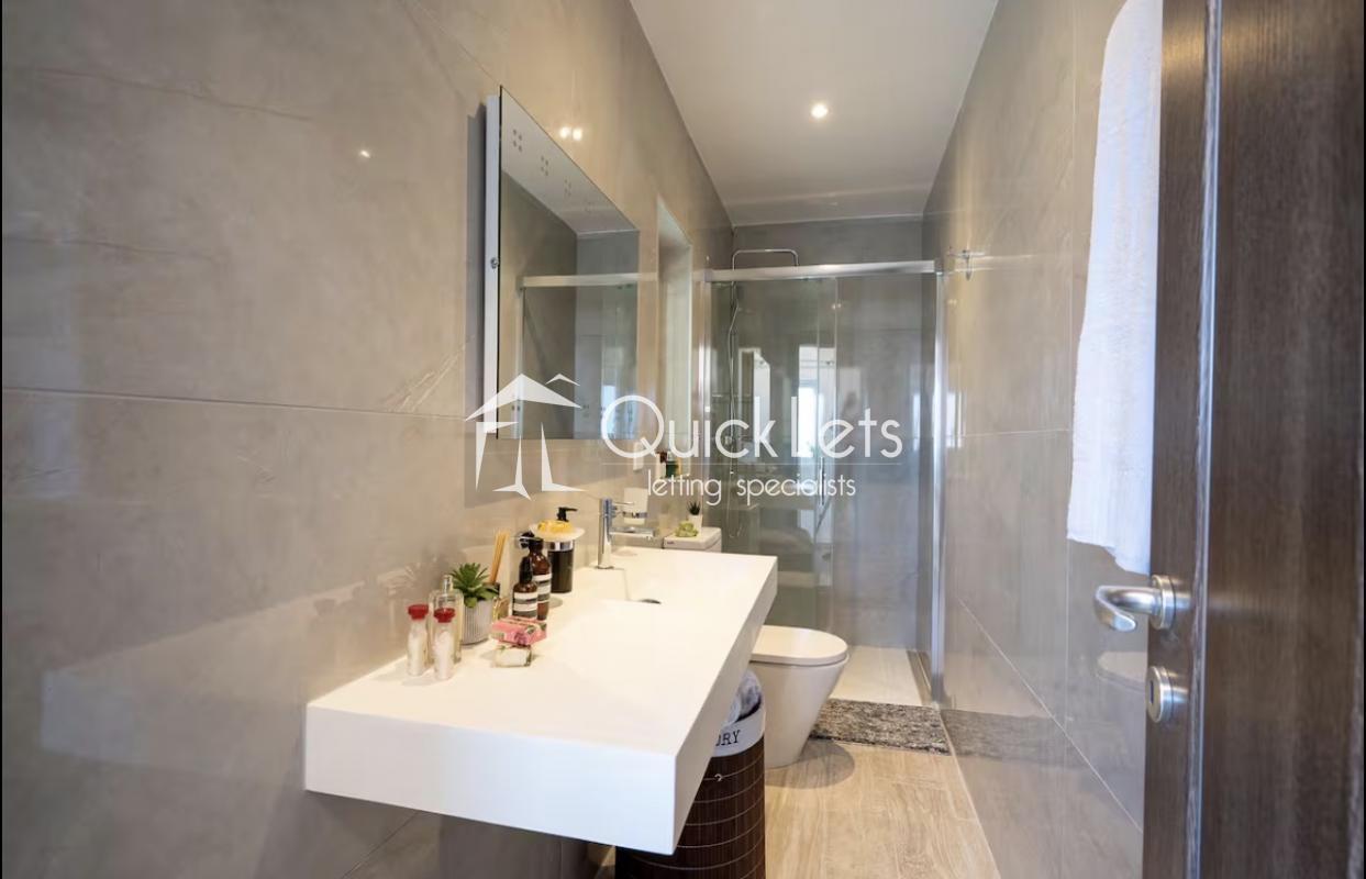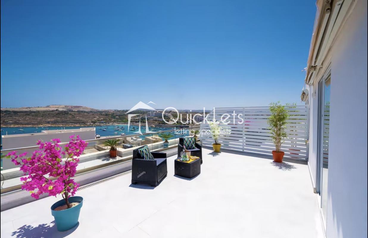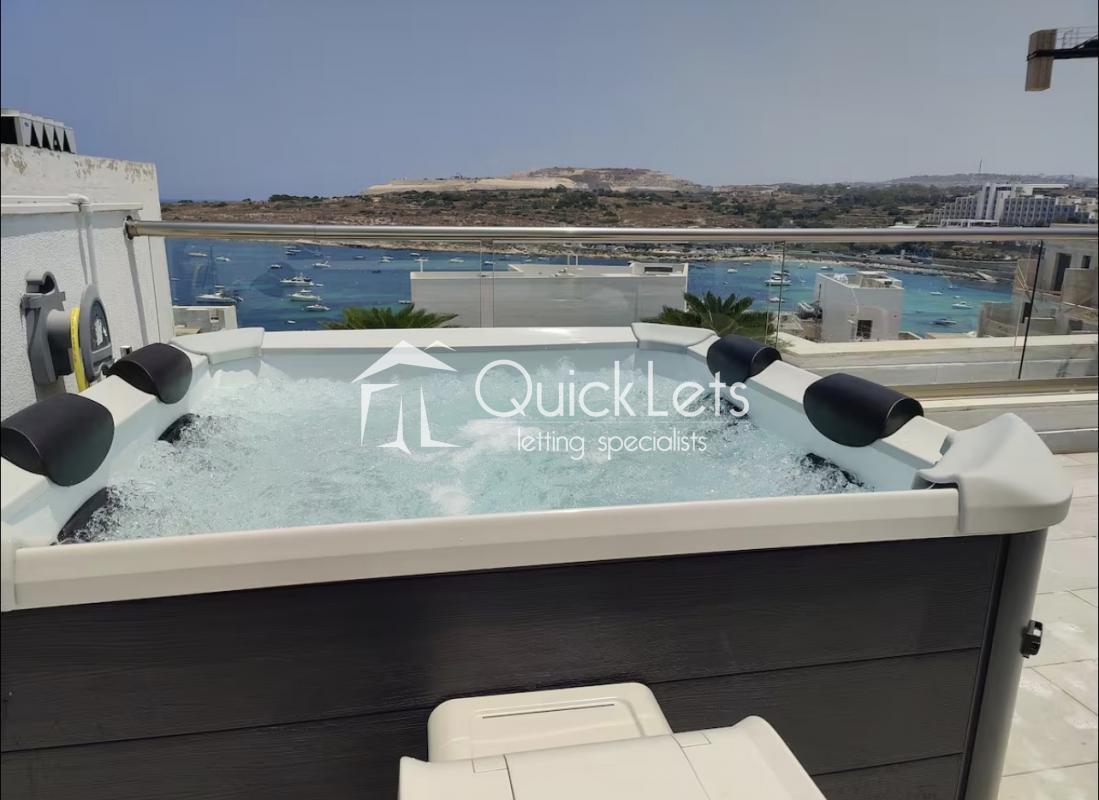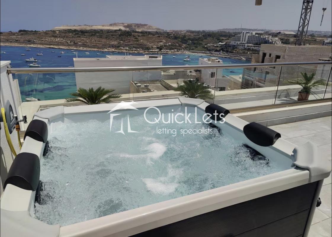 The property includes a spacious double bedroom (also with A/C), a sleek main bathroom with a walk-in shower, and a separate utility/laundry room with a washer & dryer. The real highlight is the expansive outdoor space with a Jacuzzi and panoramic views over the bay, giving you that true penthouse lifestyle in Malta.