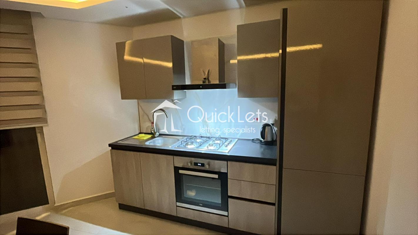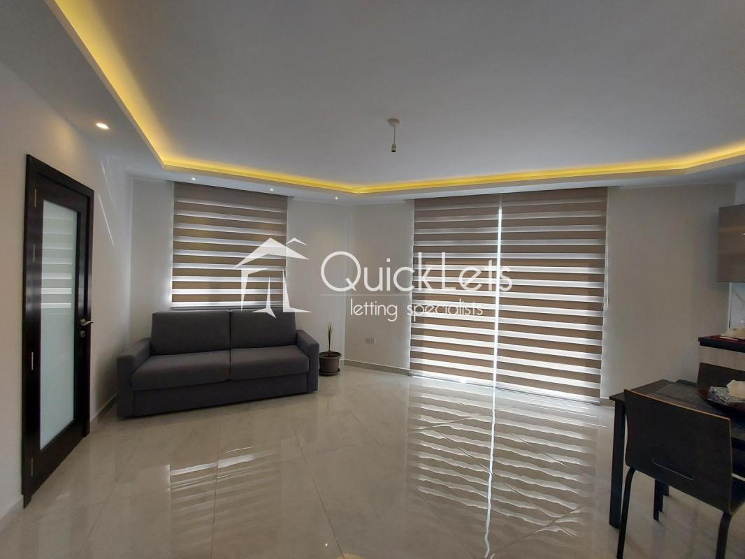 The property features a bright open-plan kitchen, living, and dining area, a guest bathroom, one double bedroom, and a front balcony. The kitchen is fully functional and equipped, and the apartment comes fully furnished and ready to move into. It is also fully air-conditioned for year-round comfort.